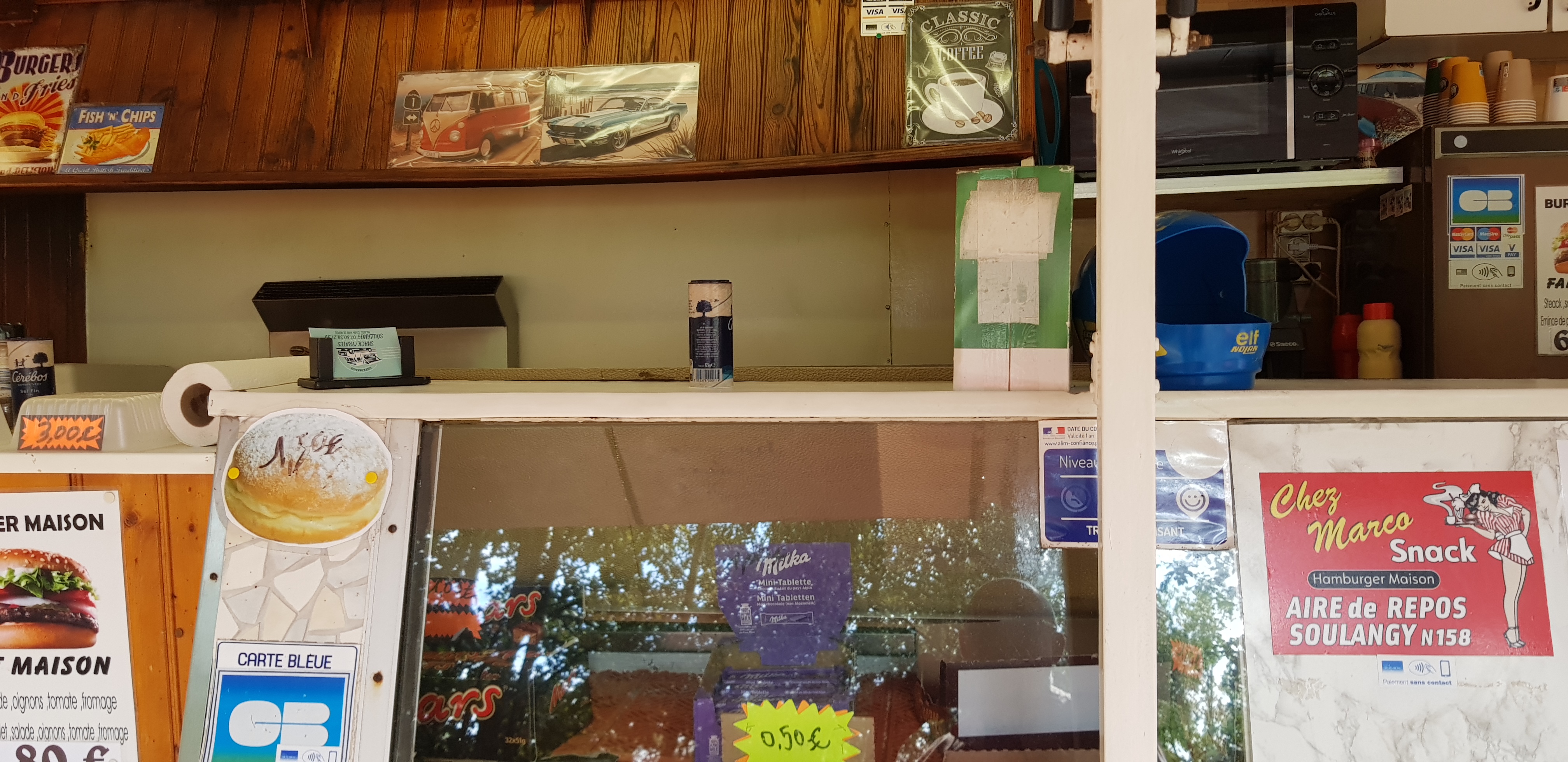 Petit snack qui dépanne en cas de fringale subite. Ne sert pas de café glacé. Ni de sauce samouraï. Sur une aire de repos dotée de toilettes.
