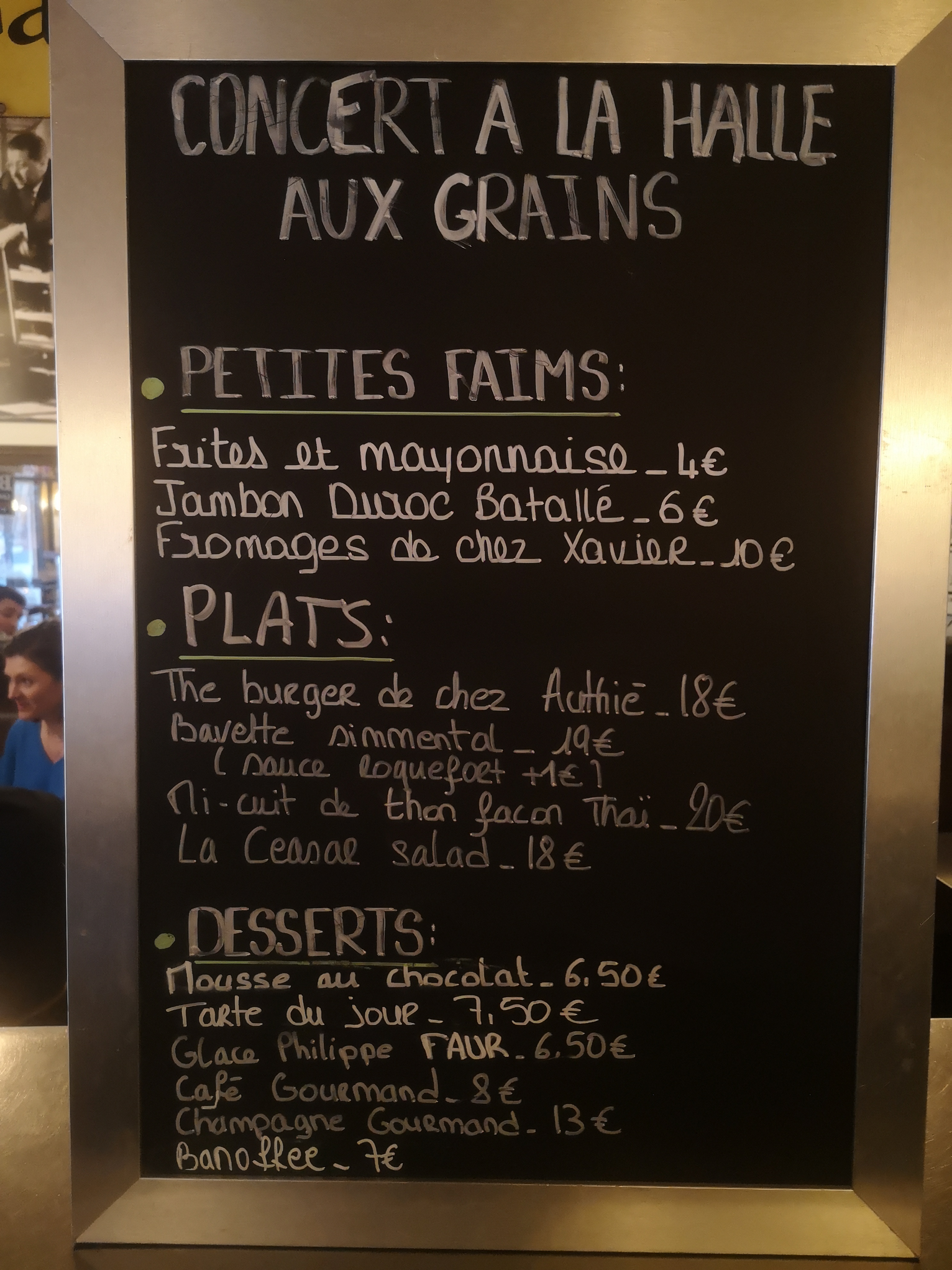 Un grand coup de cœur pour le décor d'un autre temps. Idéal après le spectacle pour un dîner sans façon. Le tartare de saumon est très réussi, le baba au rhum a ses inconditionnels. Le service est très aimable, bien que souvent débordé, la clientèle souvent composée des musiciens ayant joué à la Halle aux Grains toute proche.