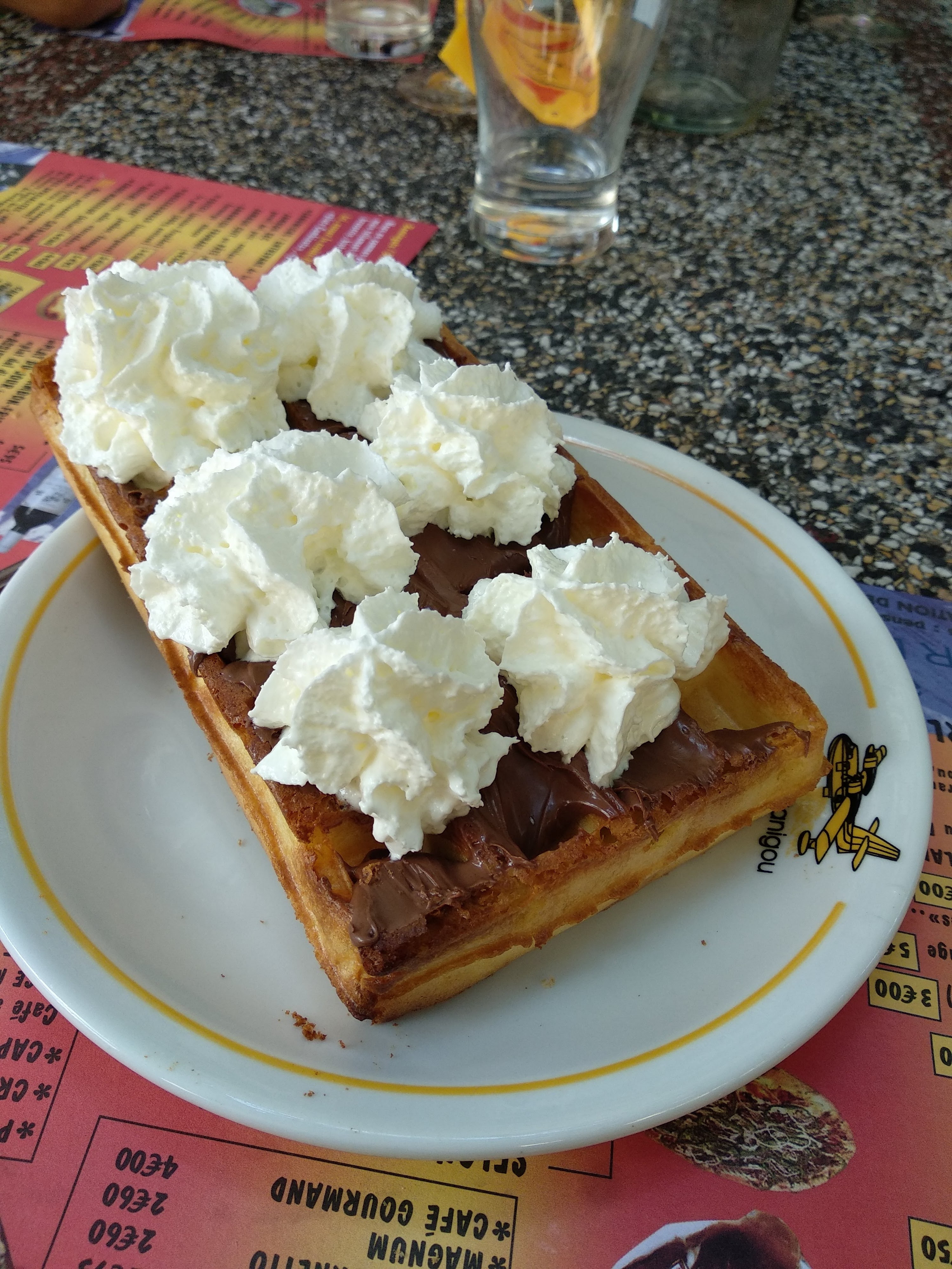 Nous avons fait une petite pause dans ce bar restaurant pour nous désaltérer et se régaler d’un goûter… La jeune serveuse, nous a pris pour ses « potes » (je me suis même demandé si elle allait pas s’installer avec nous pour prendre la commande) de plus, même si un travail d’été il faut être pro: téléphone perso dans la poche arrière du jeans. Nous avons donc commandé une limonade et un cocktail (qui a était changer en jus d’orange car ils n’en faisaient pas, ce qui n’a pas était gênant) et 2 gaufres au nutella où l’on en n a pas vu la couleur alors que celle ci nous l’a ré prononcée devant nous. Nous avons payé heureusement que nos verres ! Nous sommes parti déçu. On mangera nos gaufres autres part, ils on perdu 2 clients.