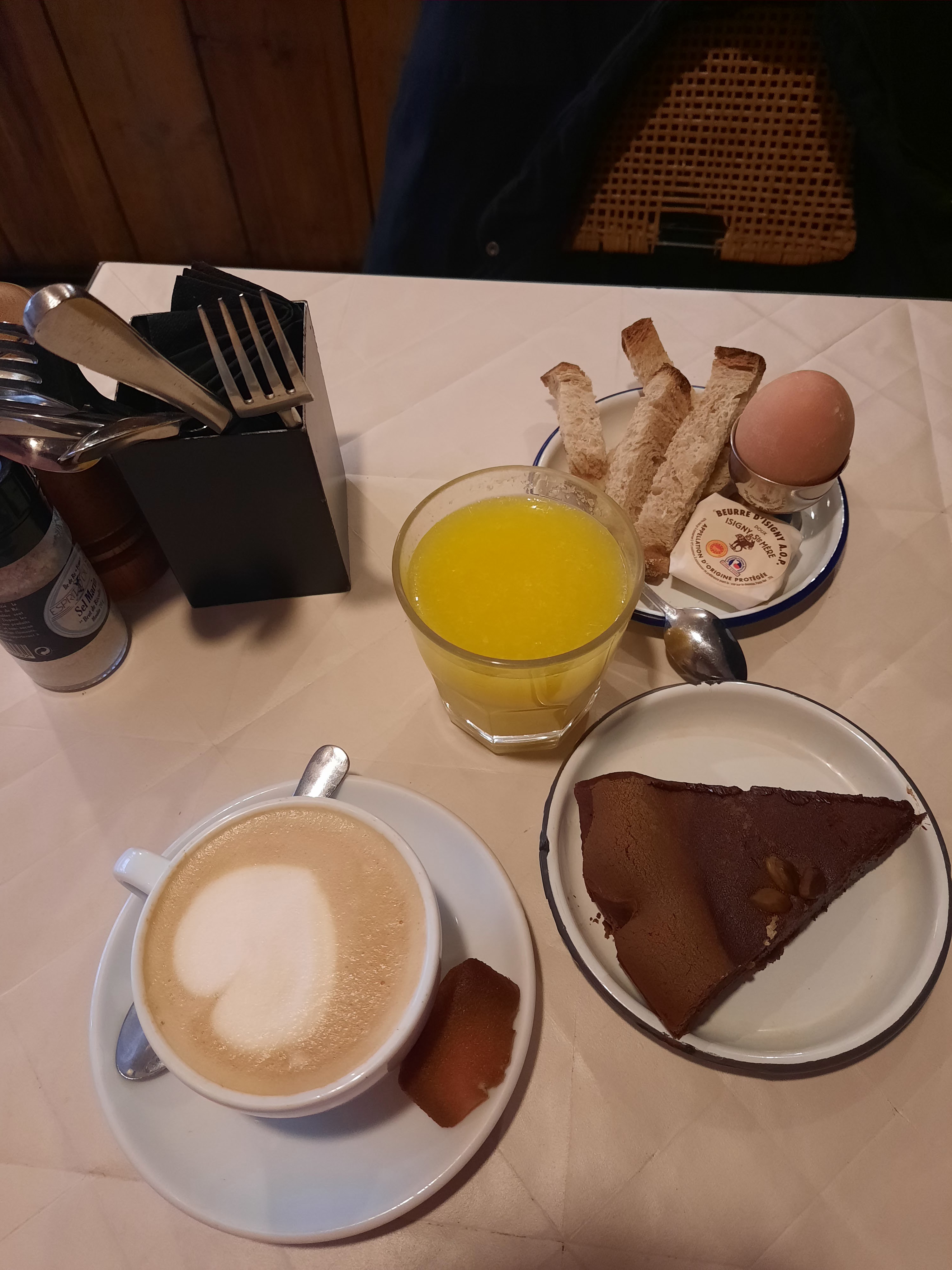 Menu petit déjeuner à 13.50 pour ma part un peu cher au vue des quantités. Le gâteau au chocolat était bon mais un peu lourd à la longue . Cadre sympa