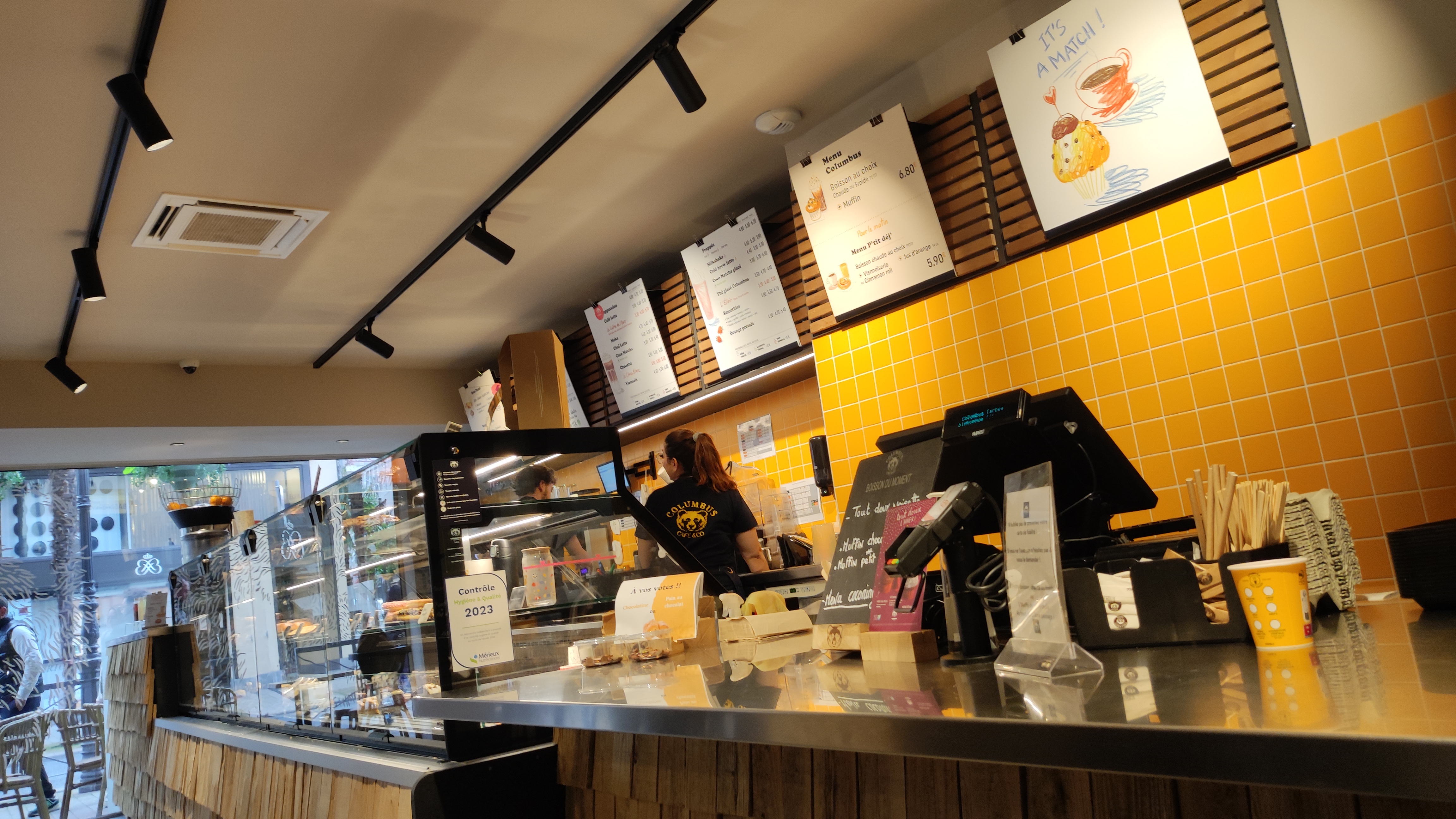 Coffee shop de la grande chaîne Columbus coffee. C’est agréable d’en avoir un en centre ville. Petite terrasse sur le trottoir. Du choix pour goûter.