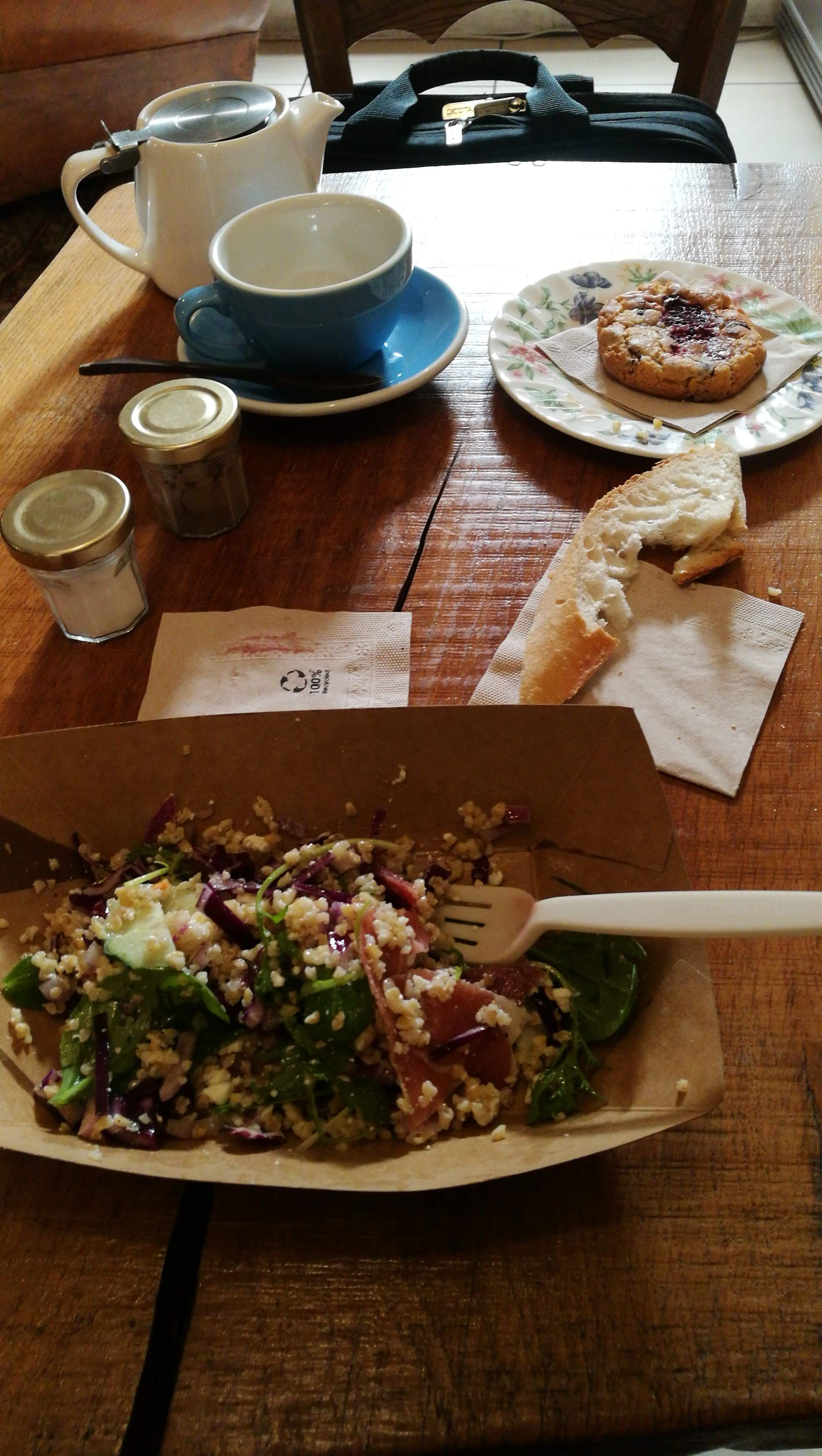Salades et cookies sympa;, ambiance boheme vintage, manque un peu de place et de clarté alors que le comptoir est immense (?)