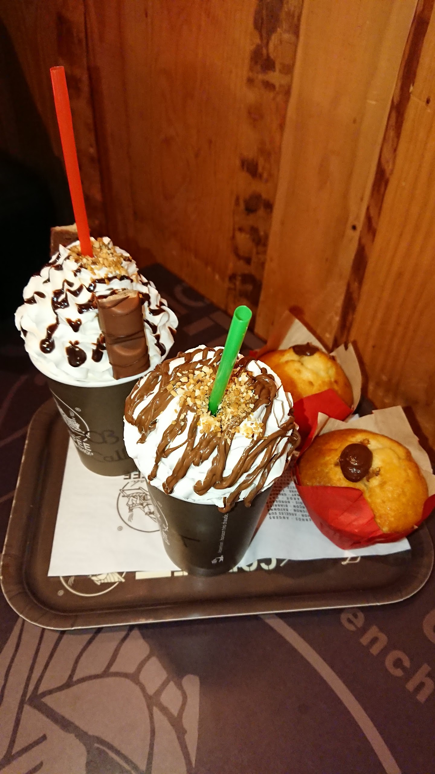 Coffee du genre Starbucks. Les chocolats sont en revanche bien meilleurs, avec chantilly et des gâteaux dedans. Pâtisseries surgelées que l'on retrouve un peu partout.