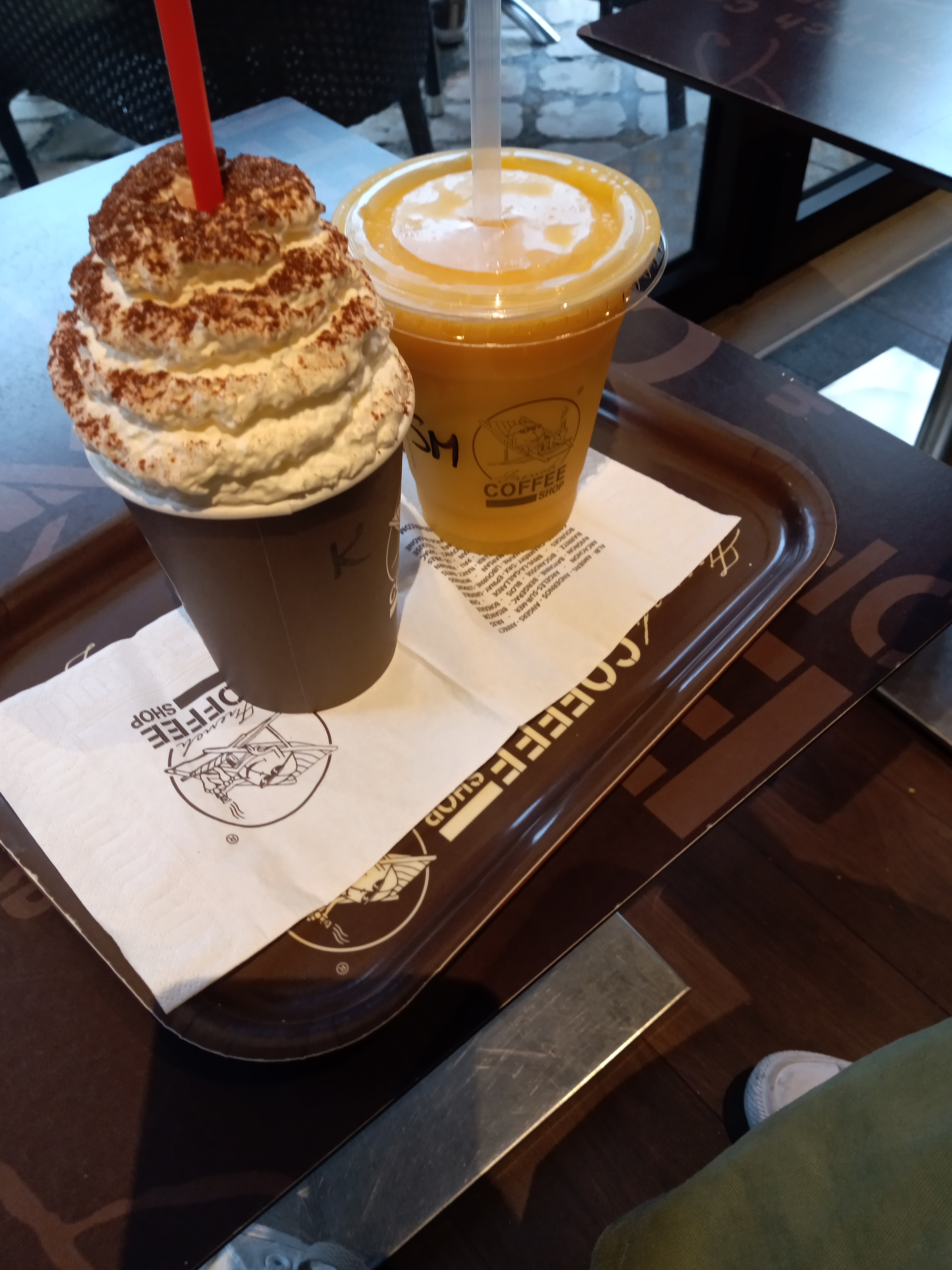 Vous commandez au comptoir !! C'est écrit en trois langues sur chaque table et je ne l'avais pas vu. Je regarde une gentille demoiselle qui m'invite à la rejoindre à la caisse. Et Dieu merci, car il y a une pancarte accrochée avec tout le choix qu'offre le lieu. Puis ils déposent les deux cafés sur le plateau et m'invitent à me servir de l'eau et du sucre à mon goût. Je prends ma table dehors et profite de mon café. Au bout d'un moment, ils font le tour et offrent à chacun un verre de la boisson la plus fraîche de leur création. Délicieux