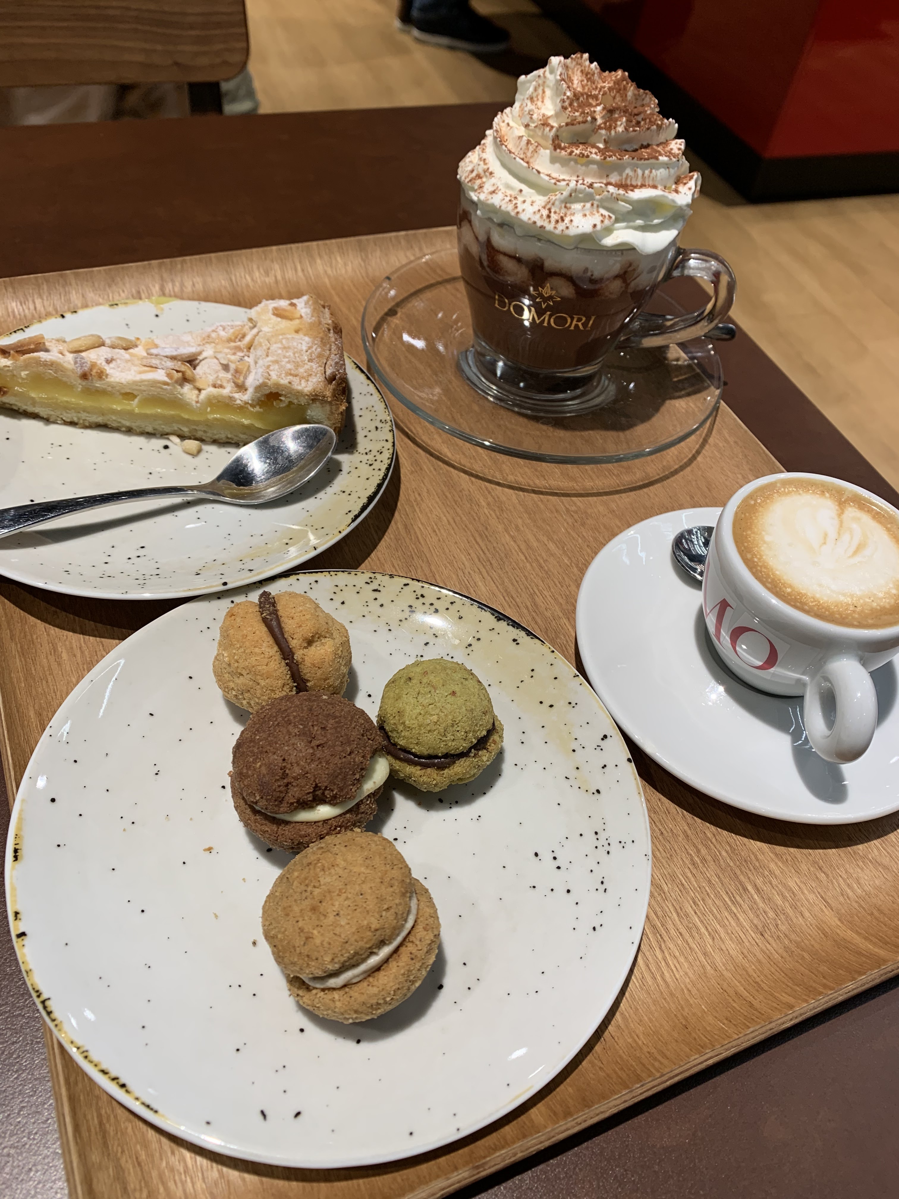 Boissons chaudes excellentes avec un petit cœur en dessin dessus Gâteaux italiens supers Je recommande ce petit bout d’Italie en France