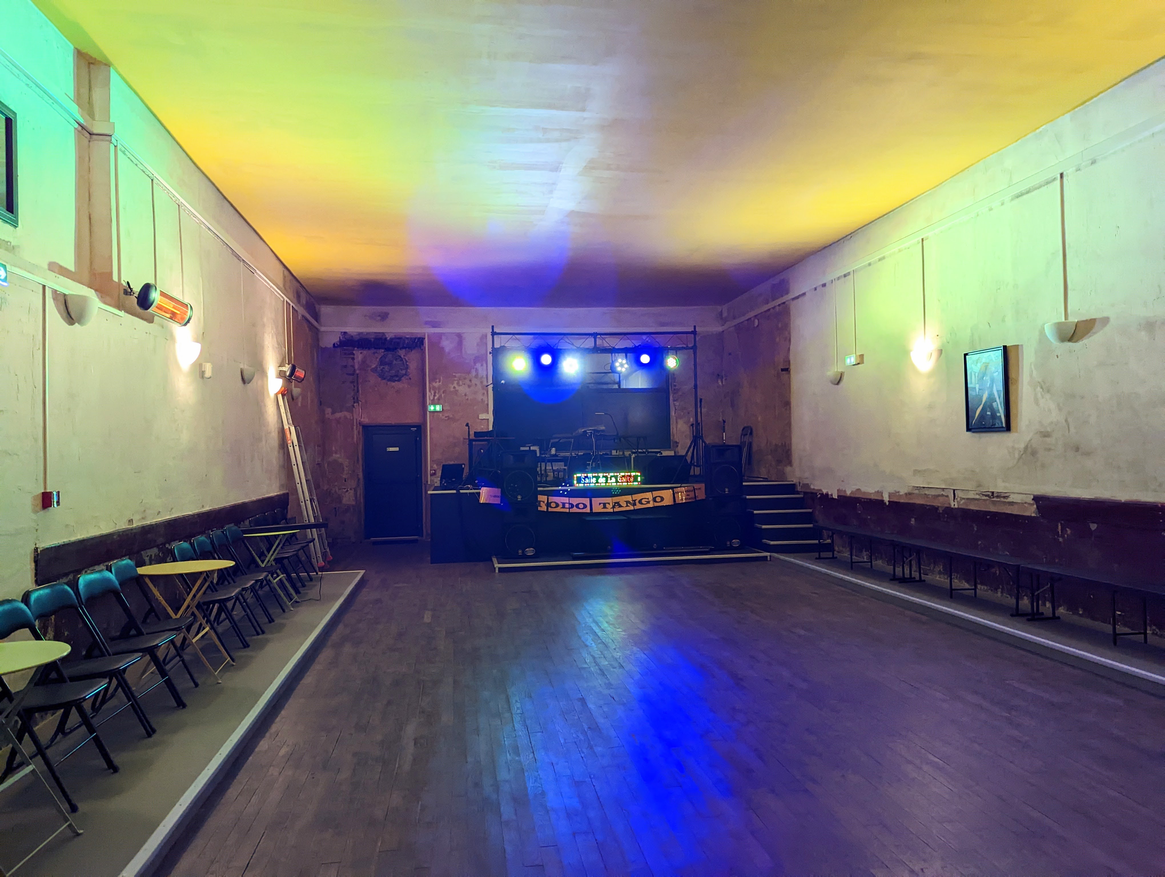 C'est entre le bistrot et salon de thé, vous serez accueilli et servi avec le sourire de Chloé. Vous pourrez entrevoir ou même visiter la salle de danse remise en état, qui permet une location pour toutes sortes de manifestations . Allez y c'est sympa. On s'y rencontrera peut-être ?