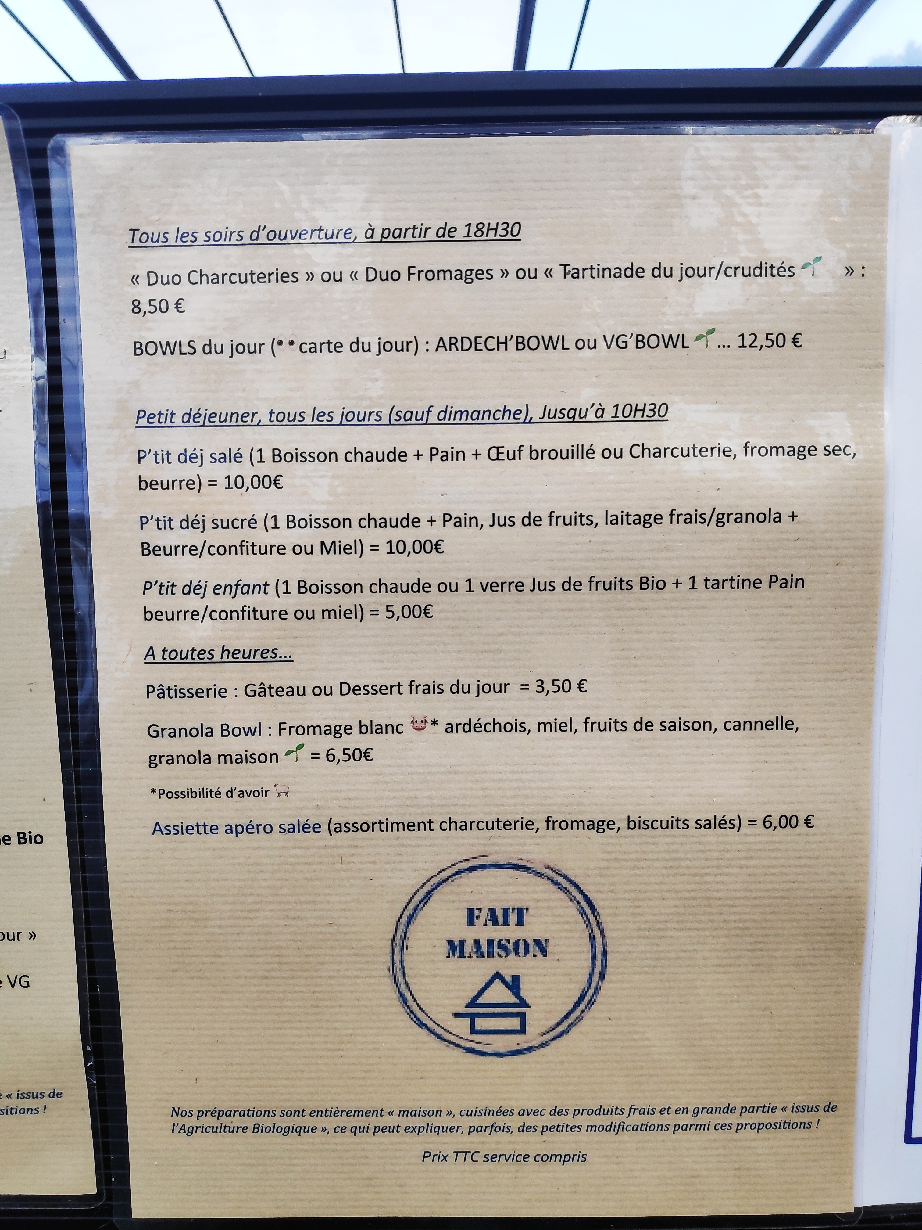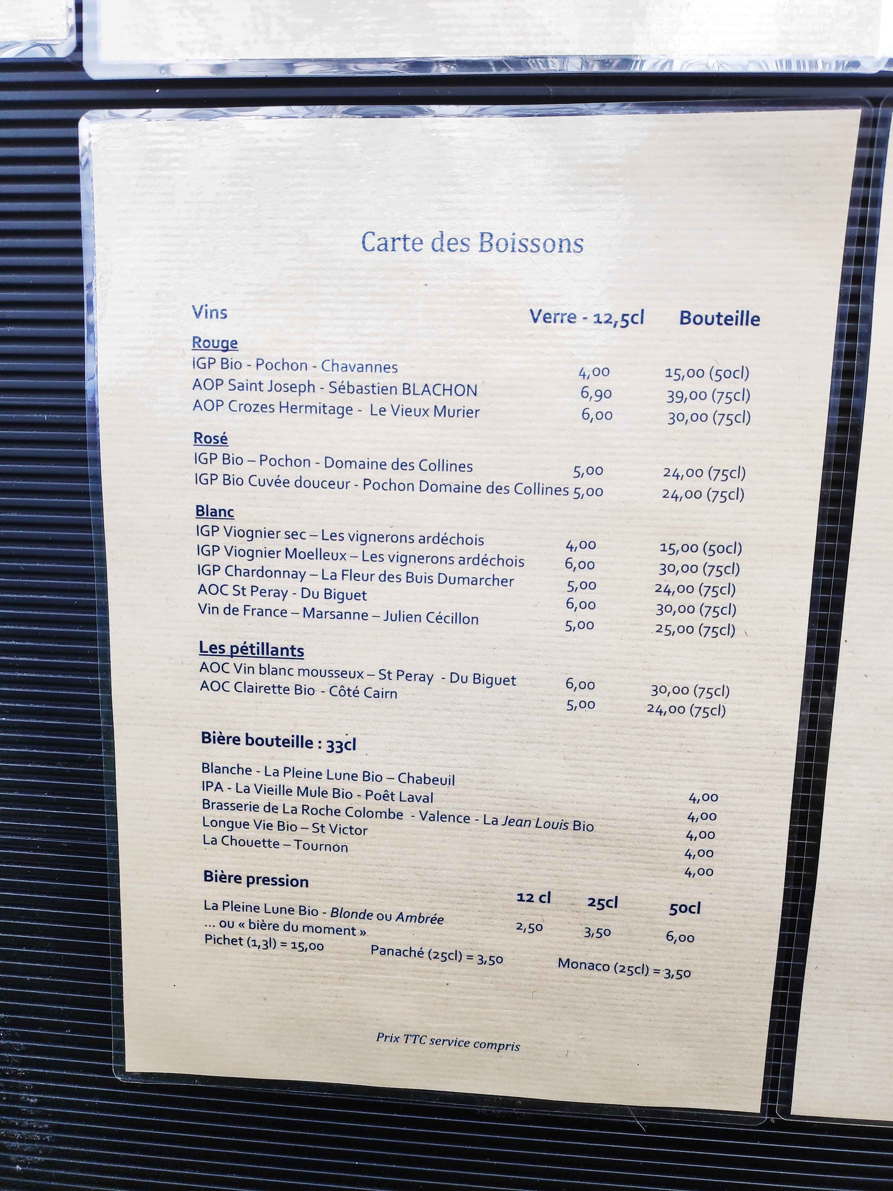 Bravo lieu agréable, etre en face des execellents vins du Rhône.. Que dire le patron est très sympathique et très dynamique ainsi que sa femme au cuisine. Un Hot dog avec des frites simple mais la saucisse était très bonne, le pain aussi avec un vin blanc du pays. Prix très correct. A découvrir sans modération.