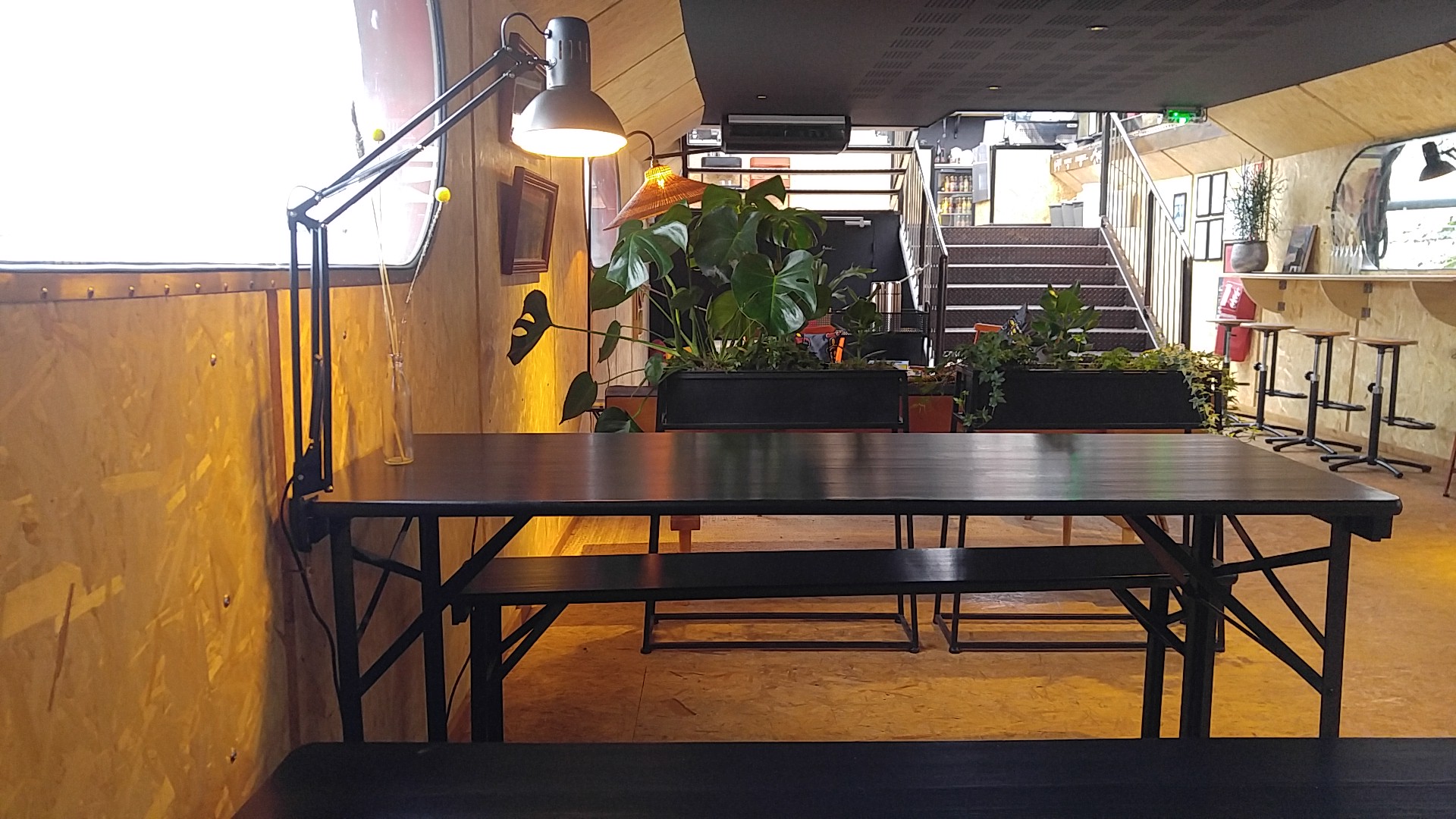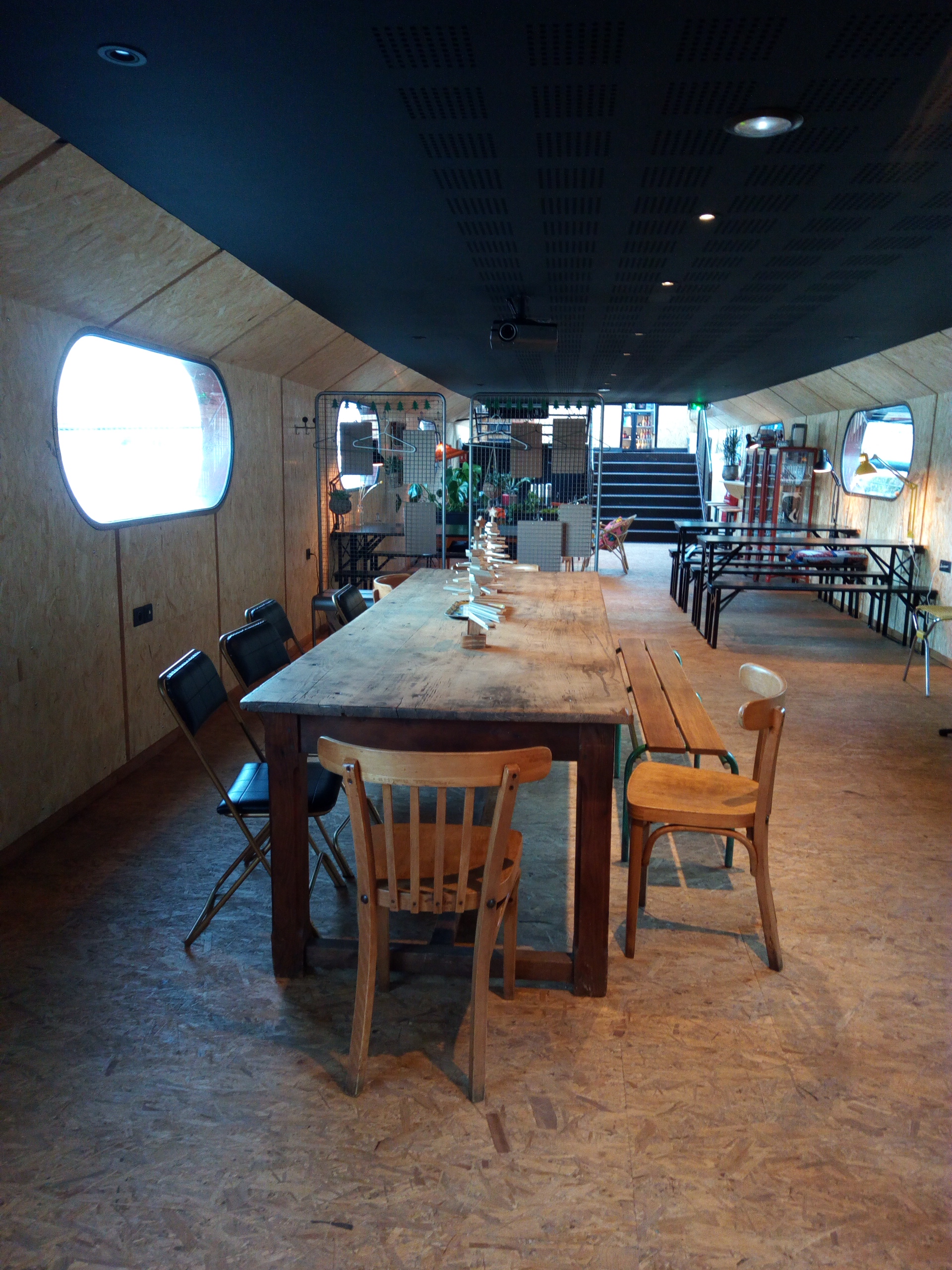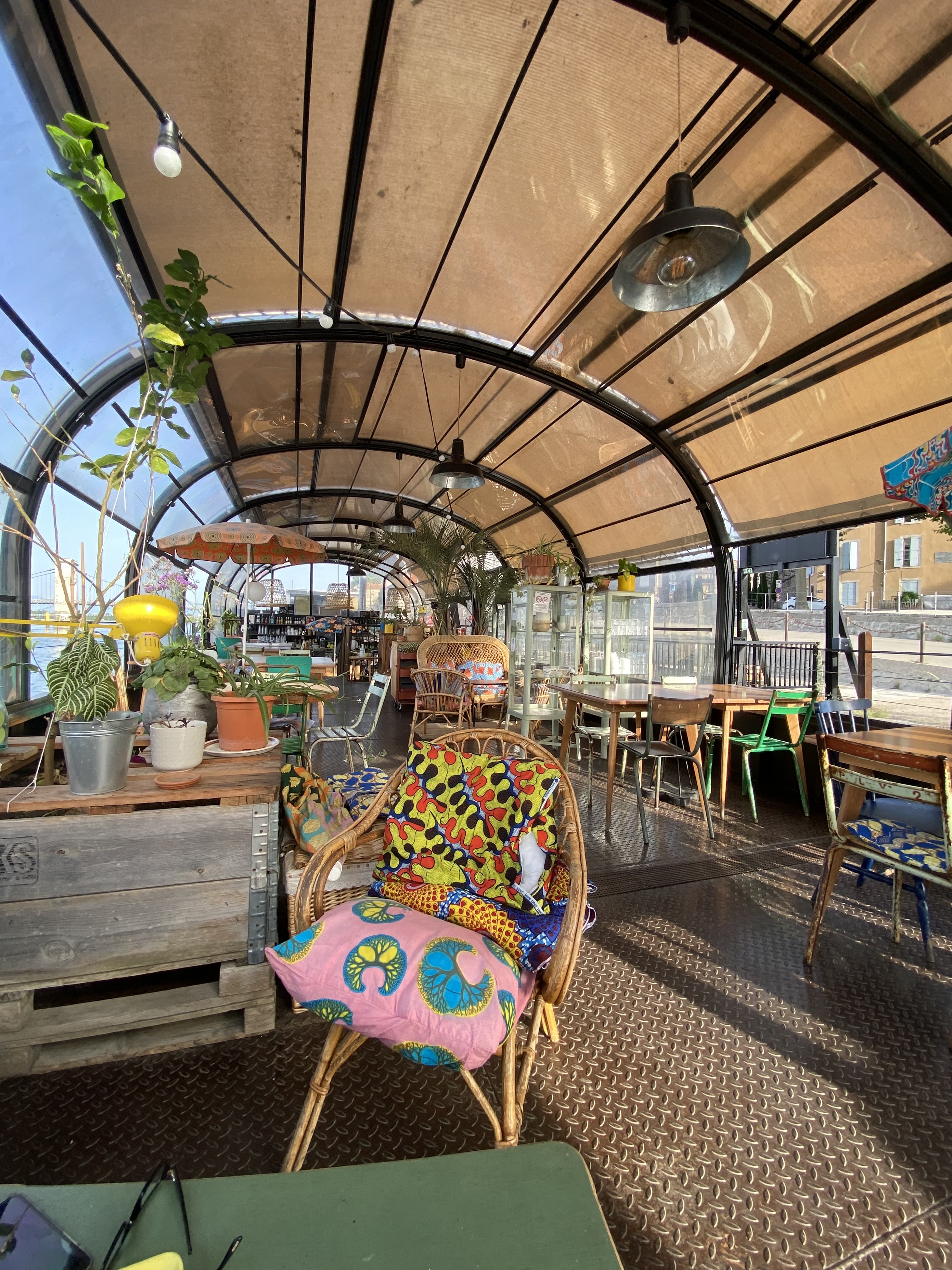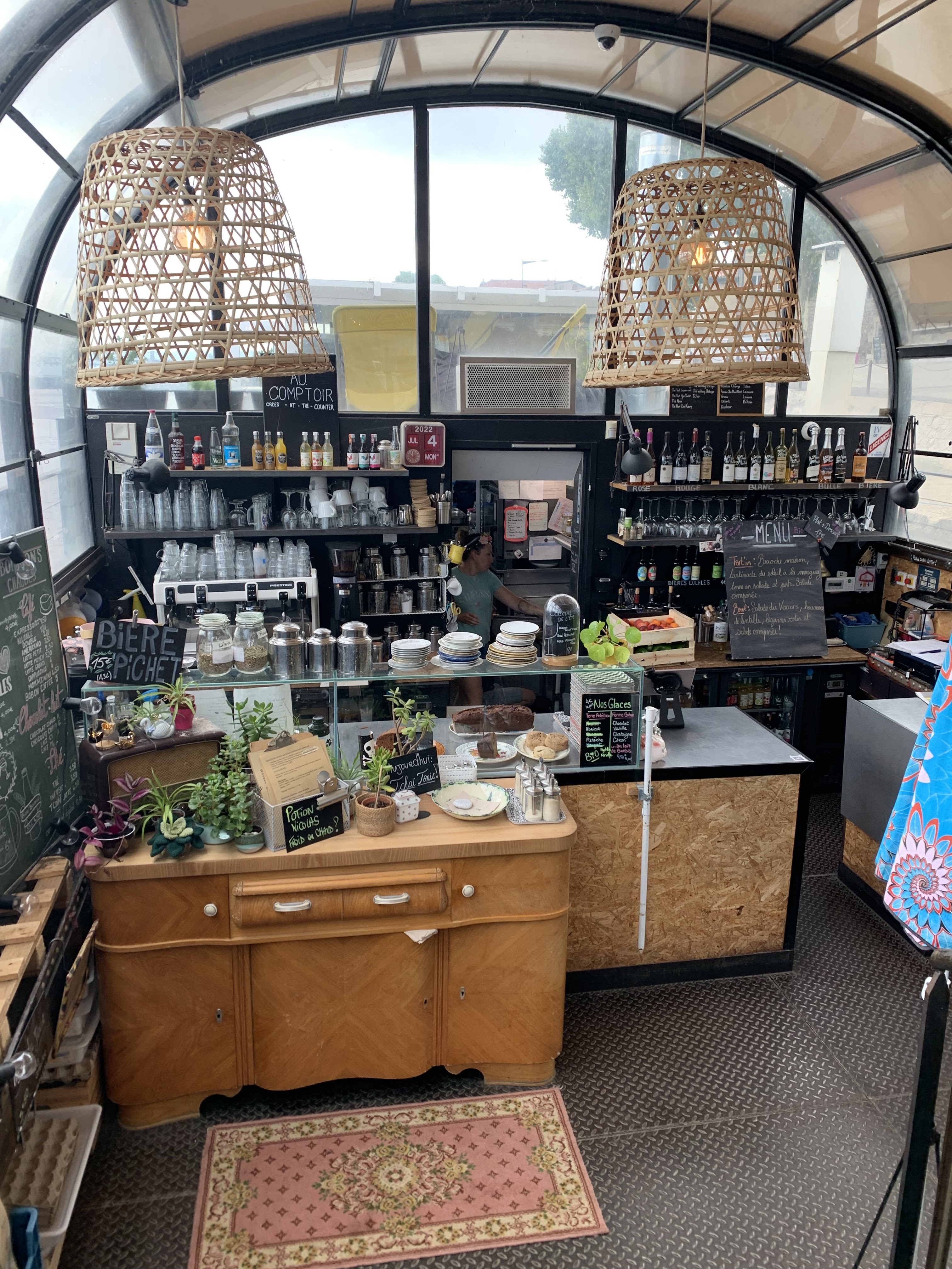 Si vous recherchez un lieu atypique vous y êtes. C est joliment amennage. Accueil et communication inexistante. Levez vous et allez commander au comptoir vous ne perdrez pas de temps. Pour les boissons sachez qu un Monaco ne sera pas rouge car ils utilisent un sirop sans colorant ( ce qui est parfait faut il que on vous l explique aimablement) Pas de pichet de rosé, ça m a coûté 5€ le verre alors que la table d à côté a eu un pichet de blanc : J'aurai aimé le savoir j' aurai eu le choix.... Les produits sont frais mais la préparation n a rien d exceptionnelle. Le pain est arrivé bien après nos plats, froid car mal décongelé. La salle végétarienne est composée de beaucoup beaucoup de salade verte. Le gratin un mélange fade de ravioles, courgettes et viande. Pour moi c est un attrape touriste😔