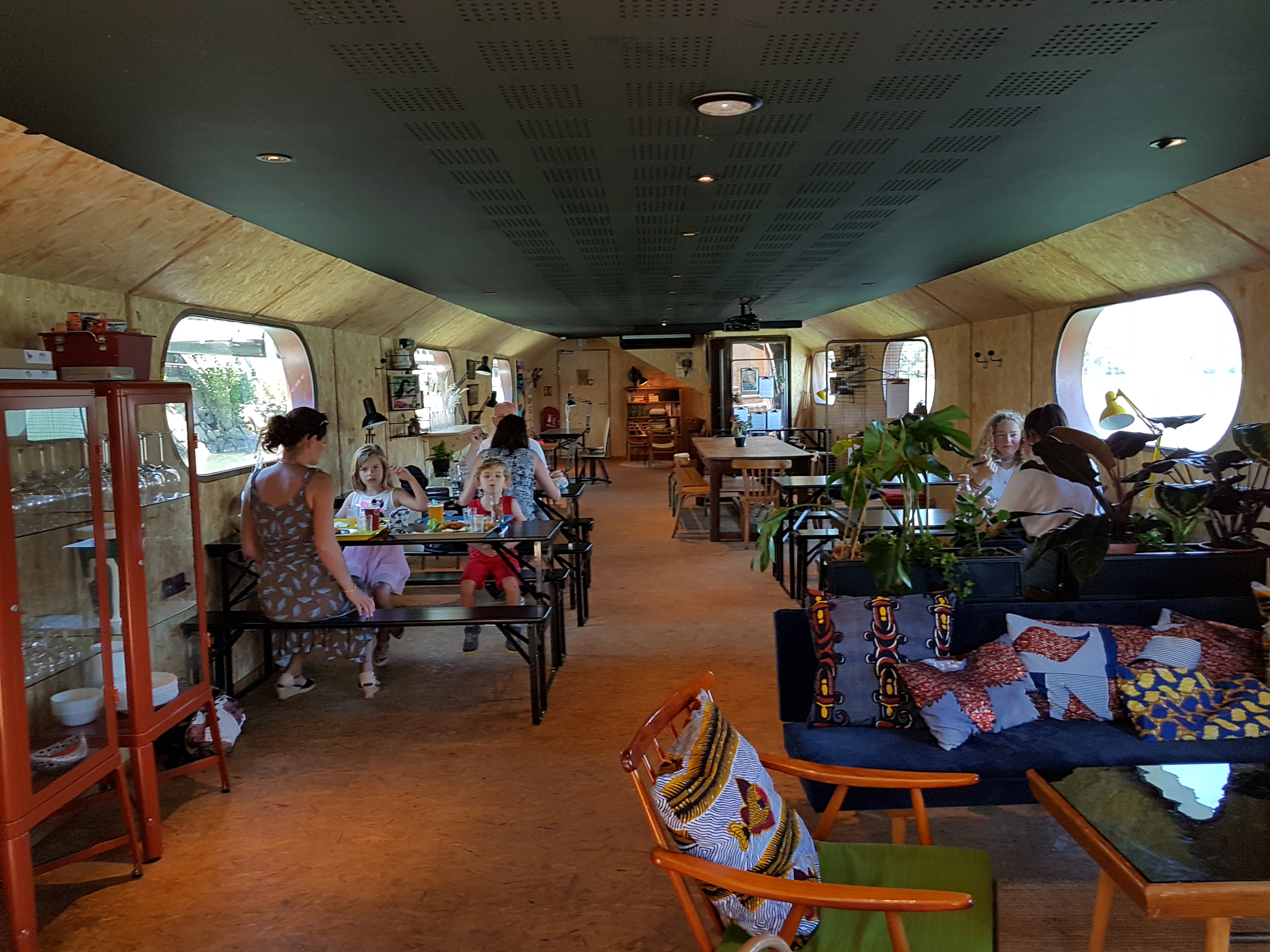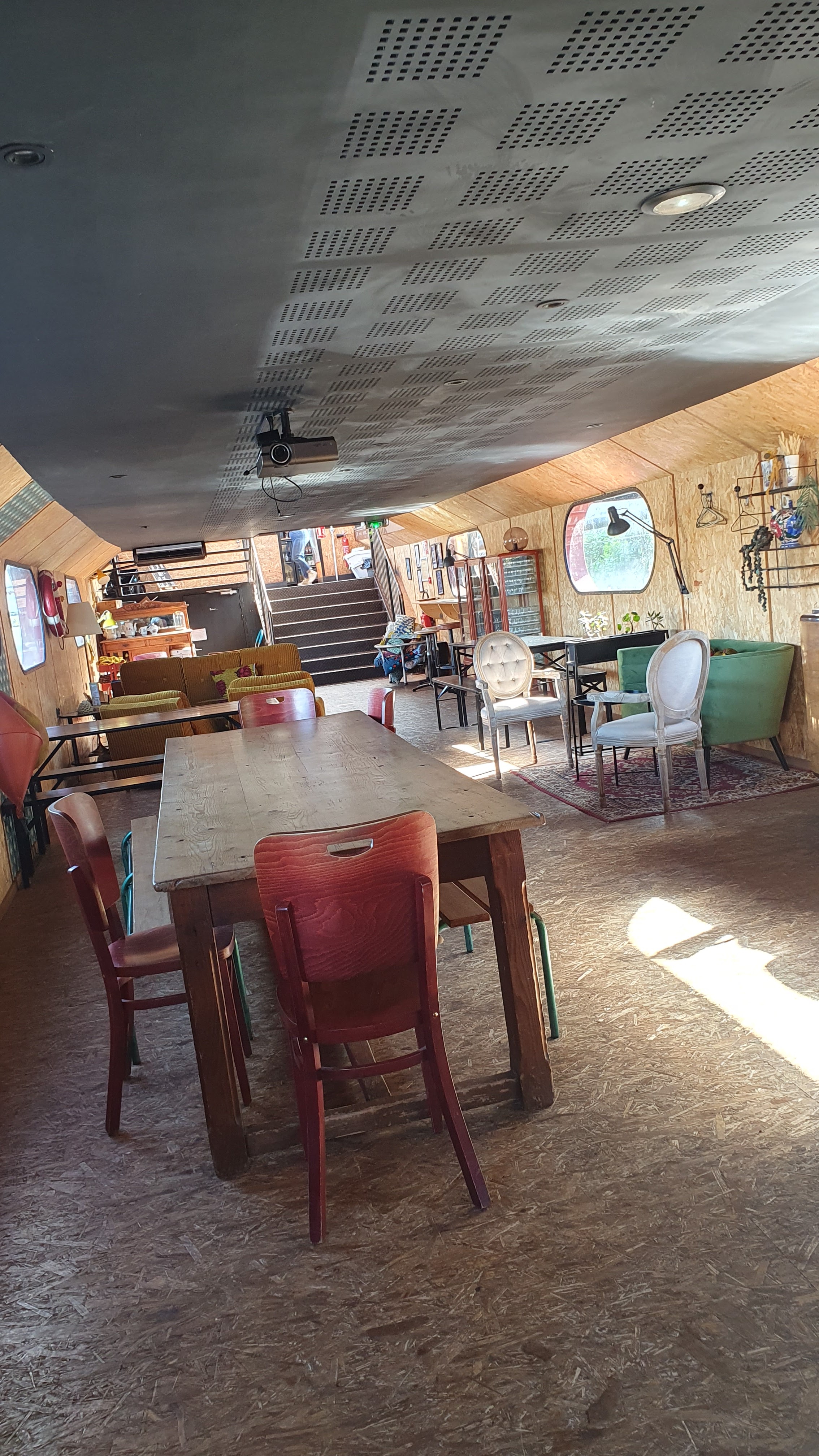 Lieu de vie très sympa . Pour tous les ages . Coin avec livres et activités pour les tout petits . Et divers livres et journaux mis a disposition des adultes . Lieu cosy . Seul bémol le service au bar est effectué par un personnel très sympathique mais le fait de prendre le temps pour servir fait que l attente de la commande peut être longue ... visite effectuée au mois de mars, a voir l été avec la partie ouverte.