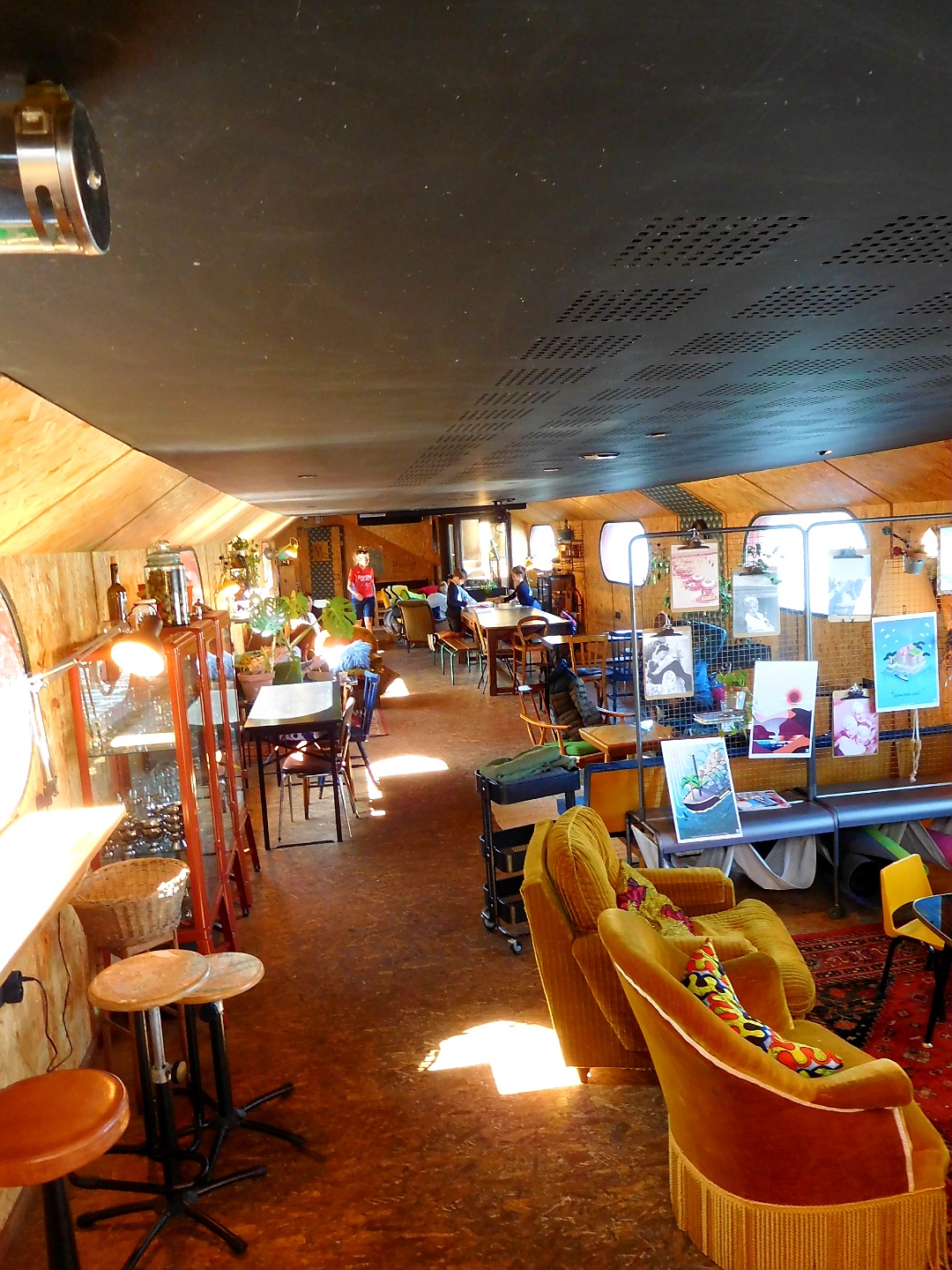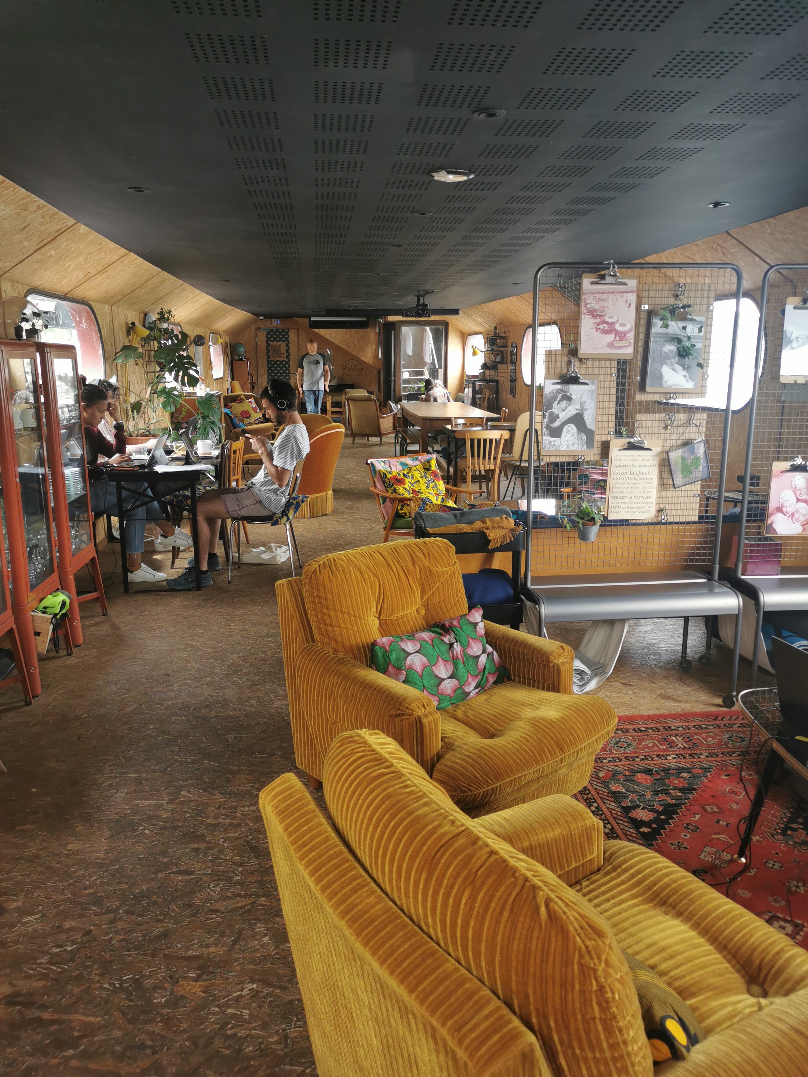 Très jolie péniche sur le Rhône, coté Ardèche. Le lieu est magnifique, superbement décoré, plein de petites détails vintage et de coussins en tissus wax. Au déjeuner, j'y ai mangé un cake à l'épinard accompagné d'une très bonne salade avec un tiramisu excellent. L'après-midi j'ai travaillé au sous-sol (si on peut dire ça) avec un bon wifi et une ambiance studieuse. Bravo aux gérantes.