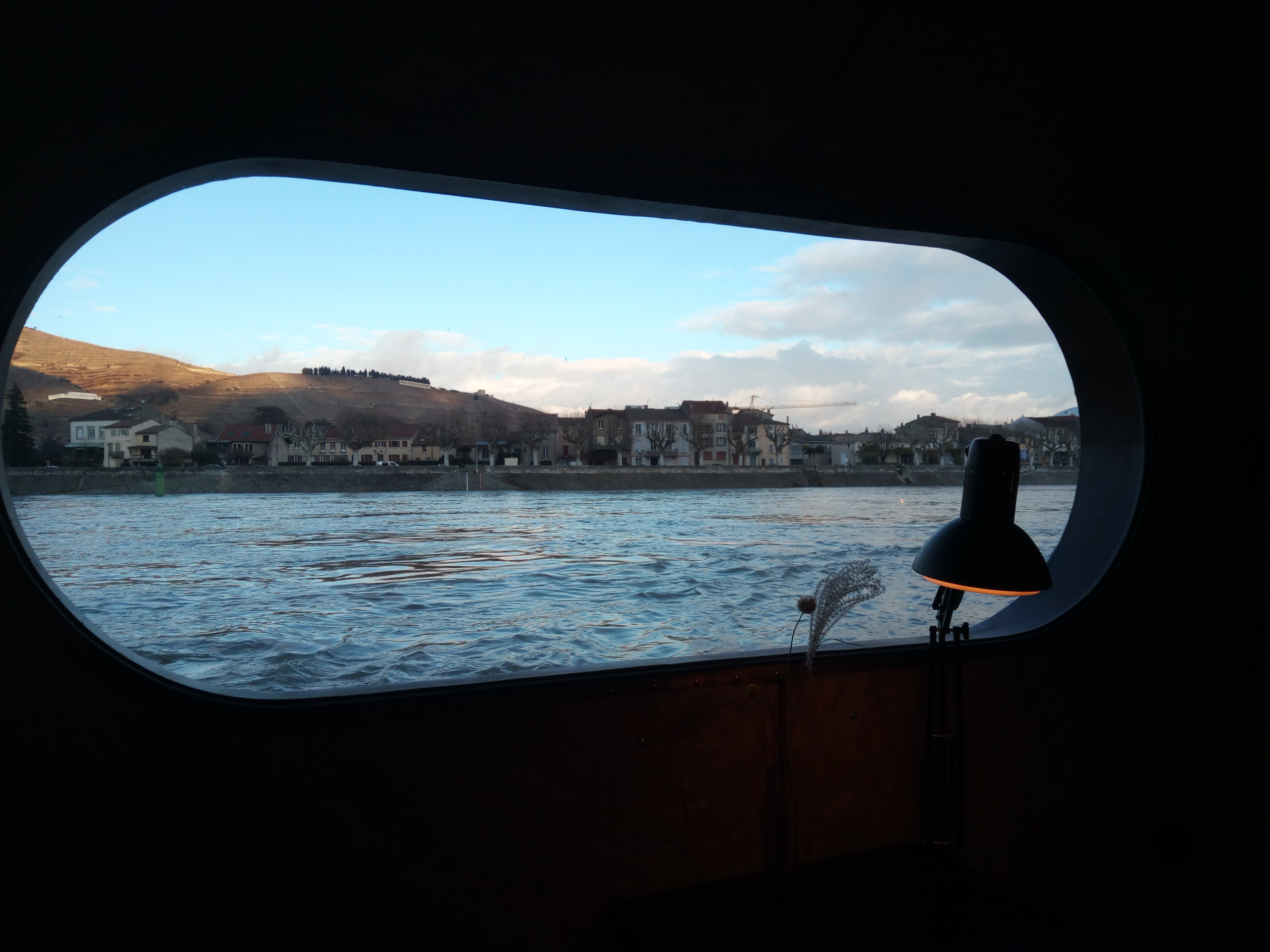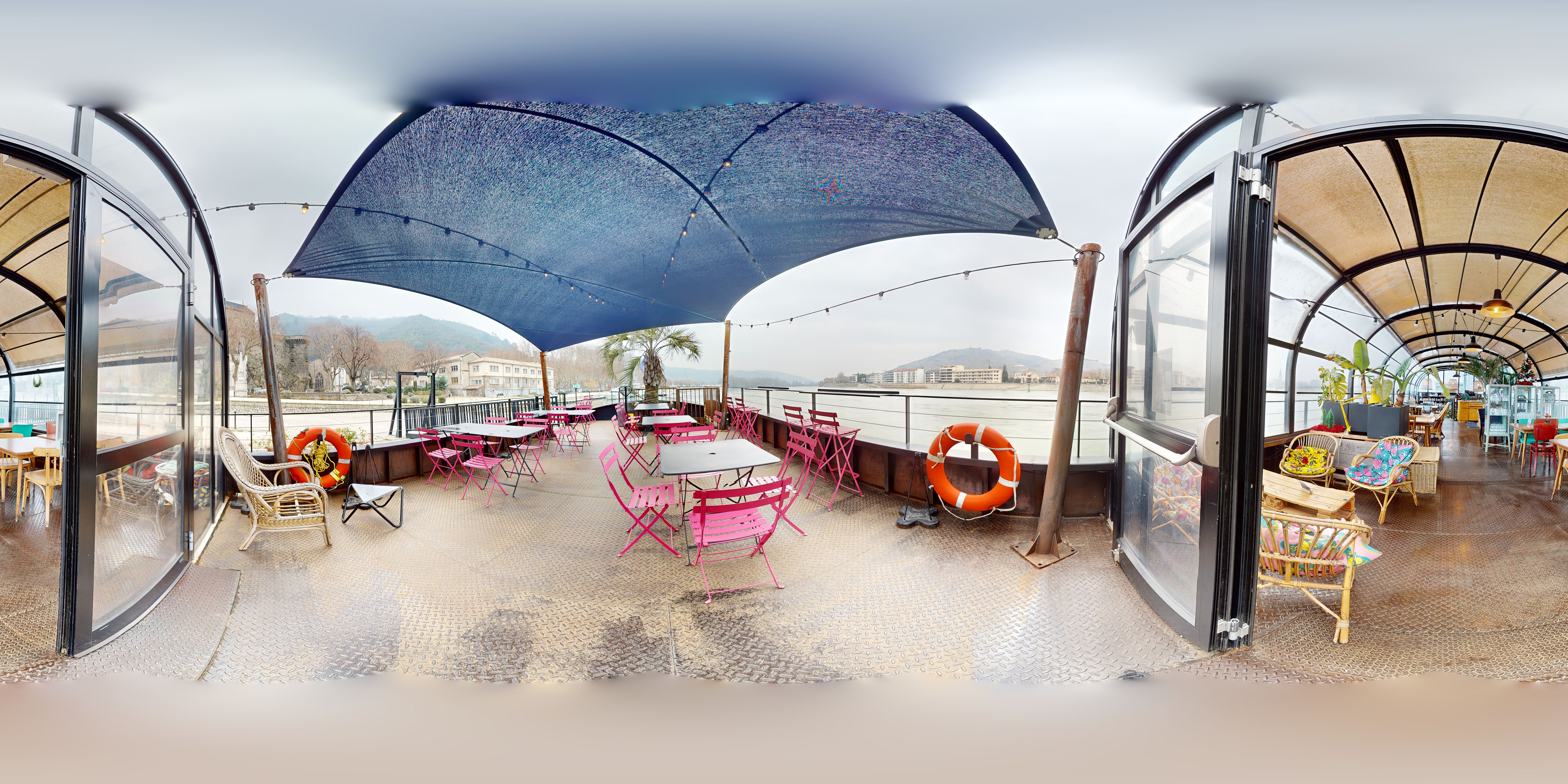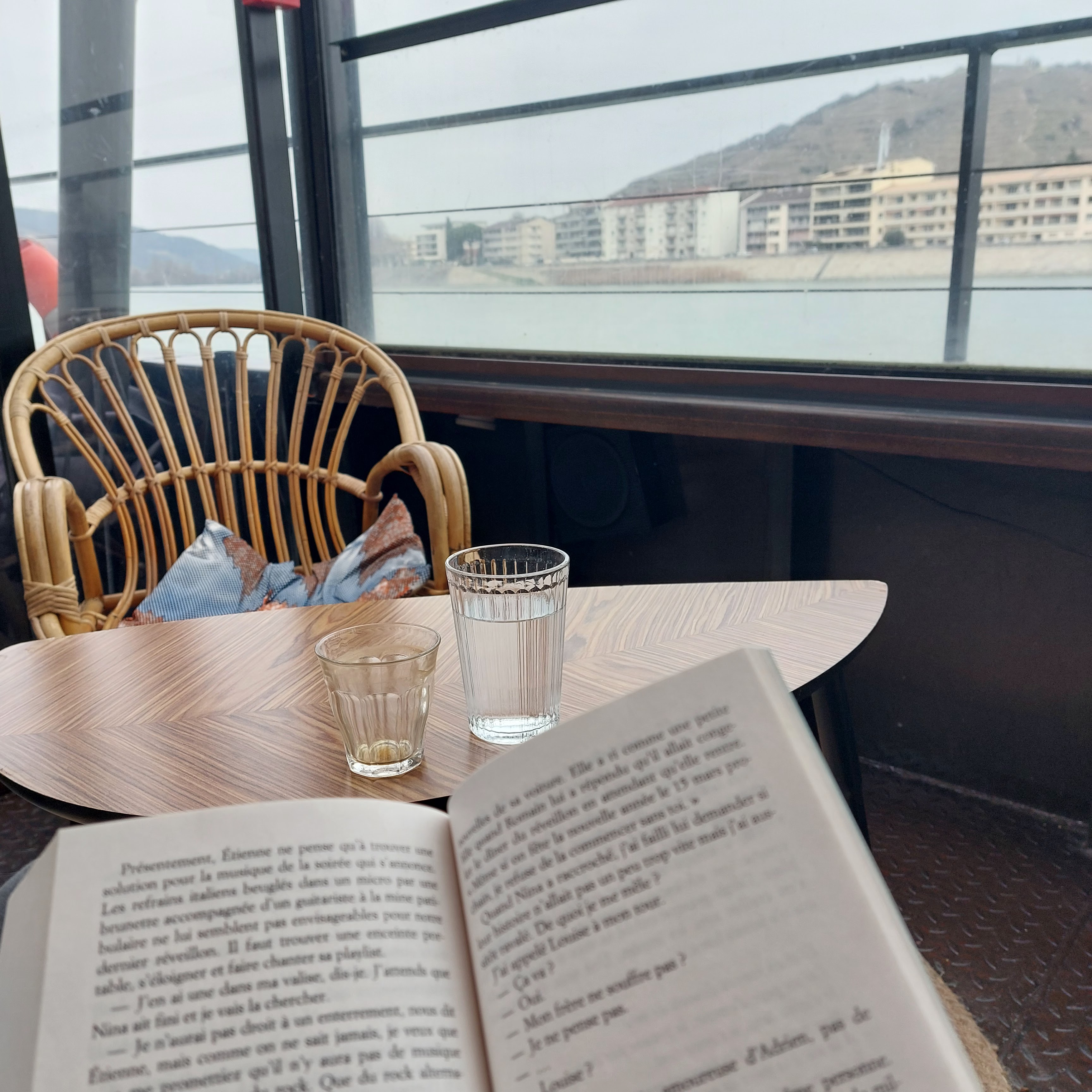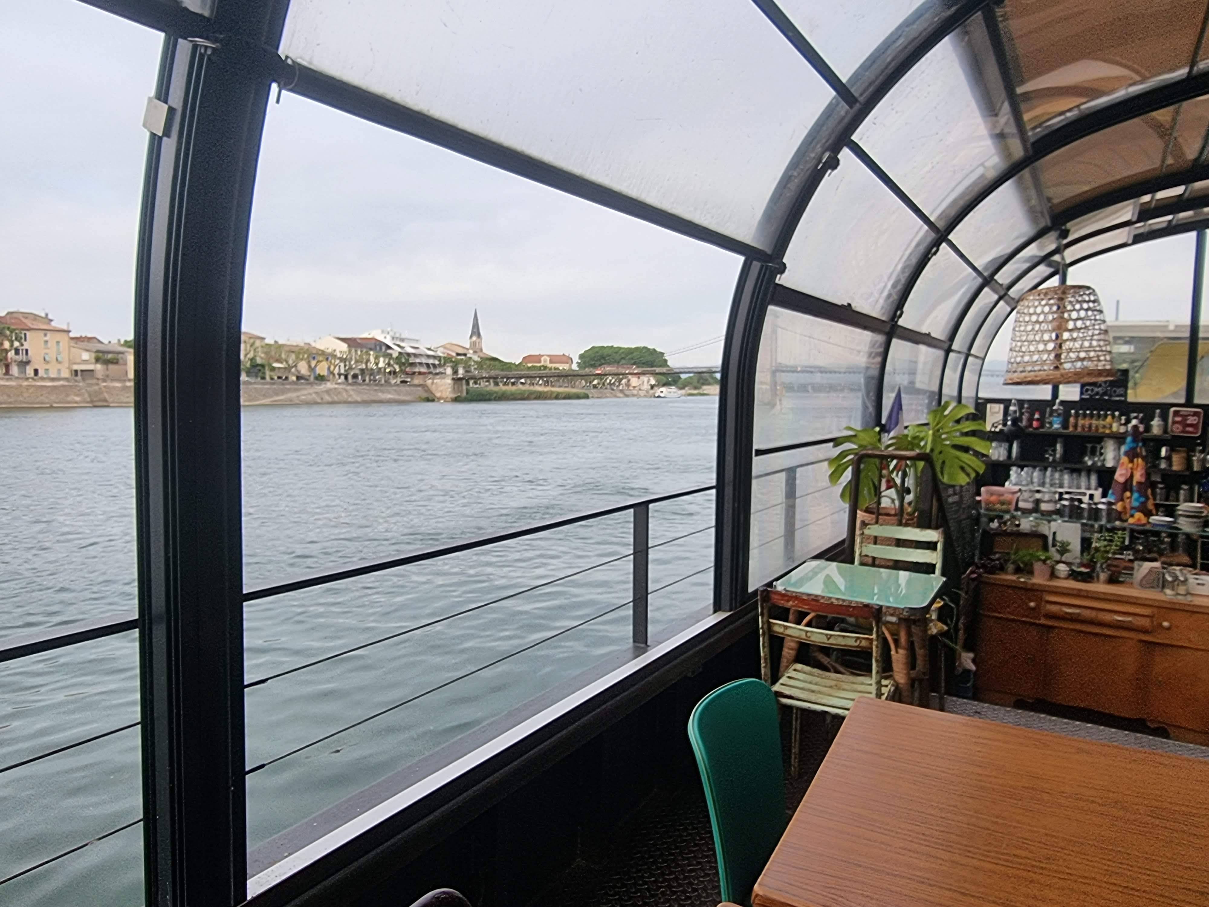 J'adore ! Cadre génial au fil de l'eau. Version vacances sur le pont avec vue d'un côté sur le Rhône, Tain-l'Hermitage, ses vignobles et sa chapelle et de l'autre sur le château de Tournon. Version cosy à l'étage inférieur au ras de l'eau avec fauteuils, canapé, livres et jeux. Produits bio et locaux, des recettes innovantes, play liste agréable et équipe sympa. Parfait pour se détendre et avoir une impression de vacances.