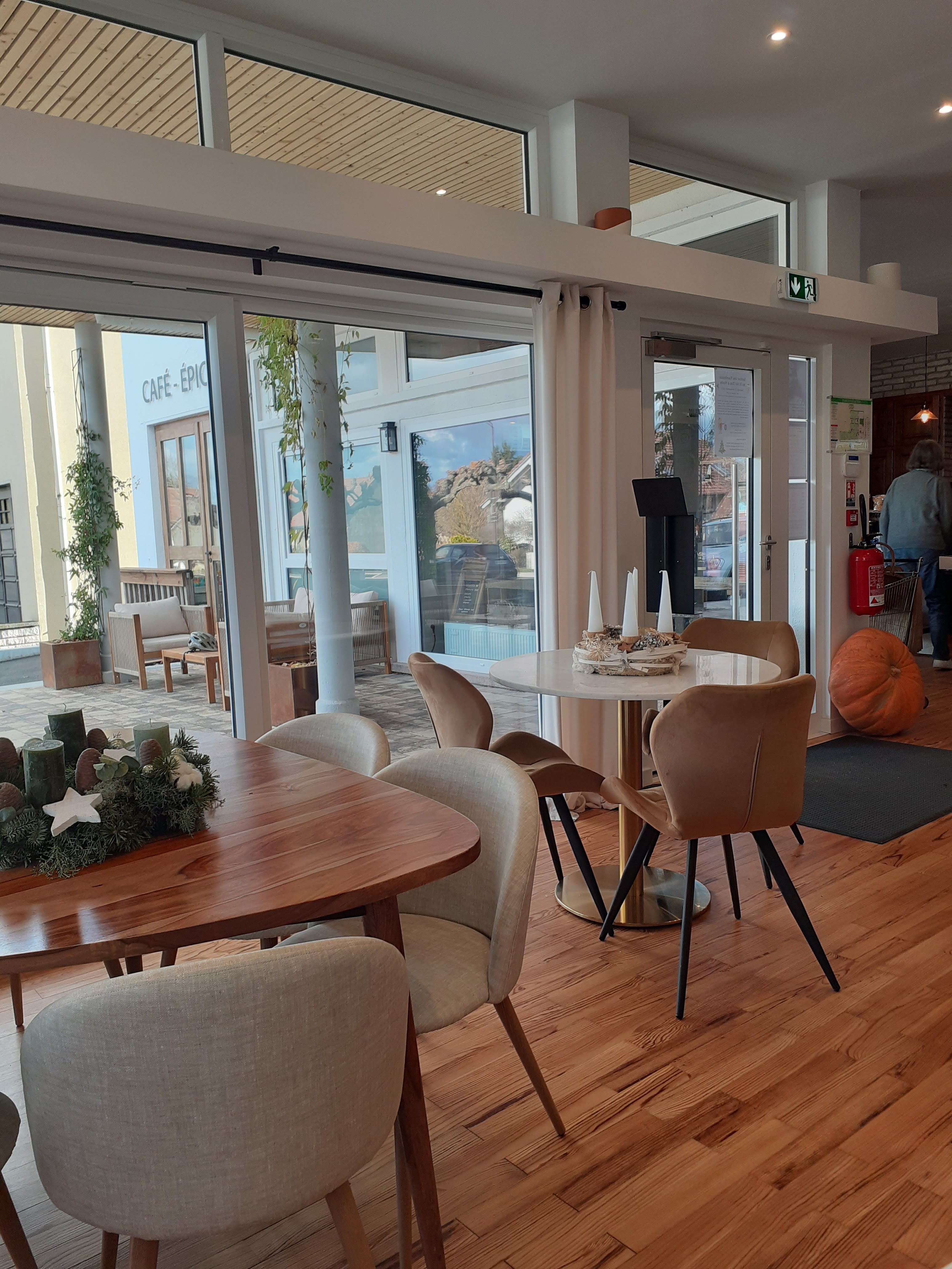 Bistrot au look rétro très moderne, café avec terrasse extérieure. Il y a de délicieuses choses à manger au restaurant et à emporter. De nombreuses spécialités régionales sont également à vendre. Il se trouve à seulement 500 mètres de l'aire de stationnement pour camping-car et vous recevrez chaque jour des baguettes et des croissants frais. L'opératrice est très gentille et parle également allemand. Tout est très propre et bien entretenu. Ça vaut le détour !