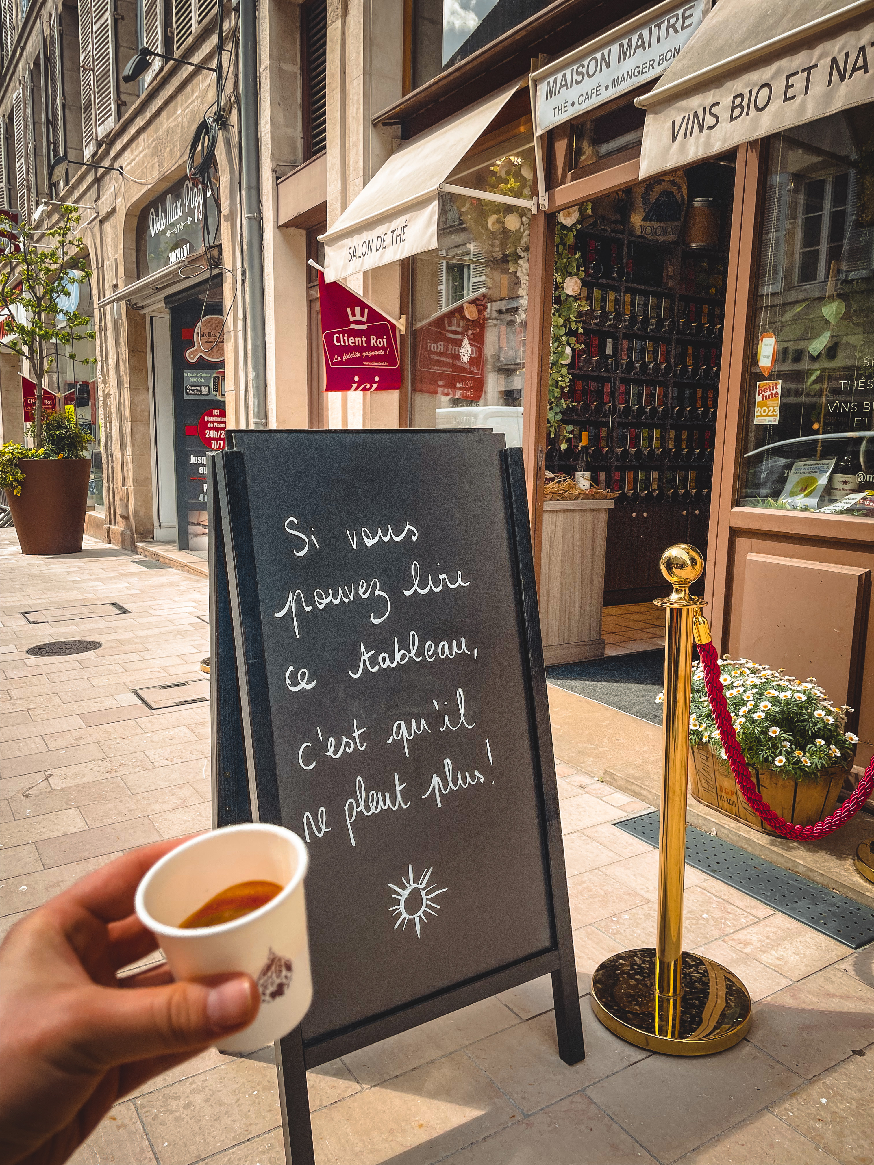 Petite pause café au sec pendant que la pluie arrosait la belle ville de Dole. Belle carte de café et thé, bière et vin ! A visiter