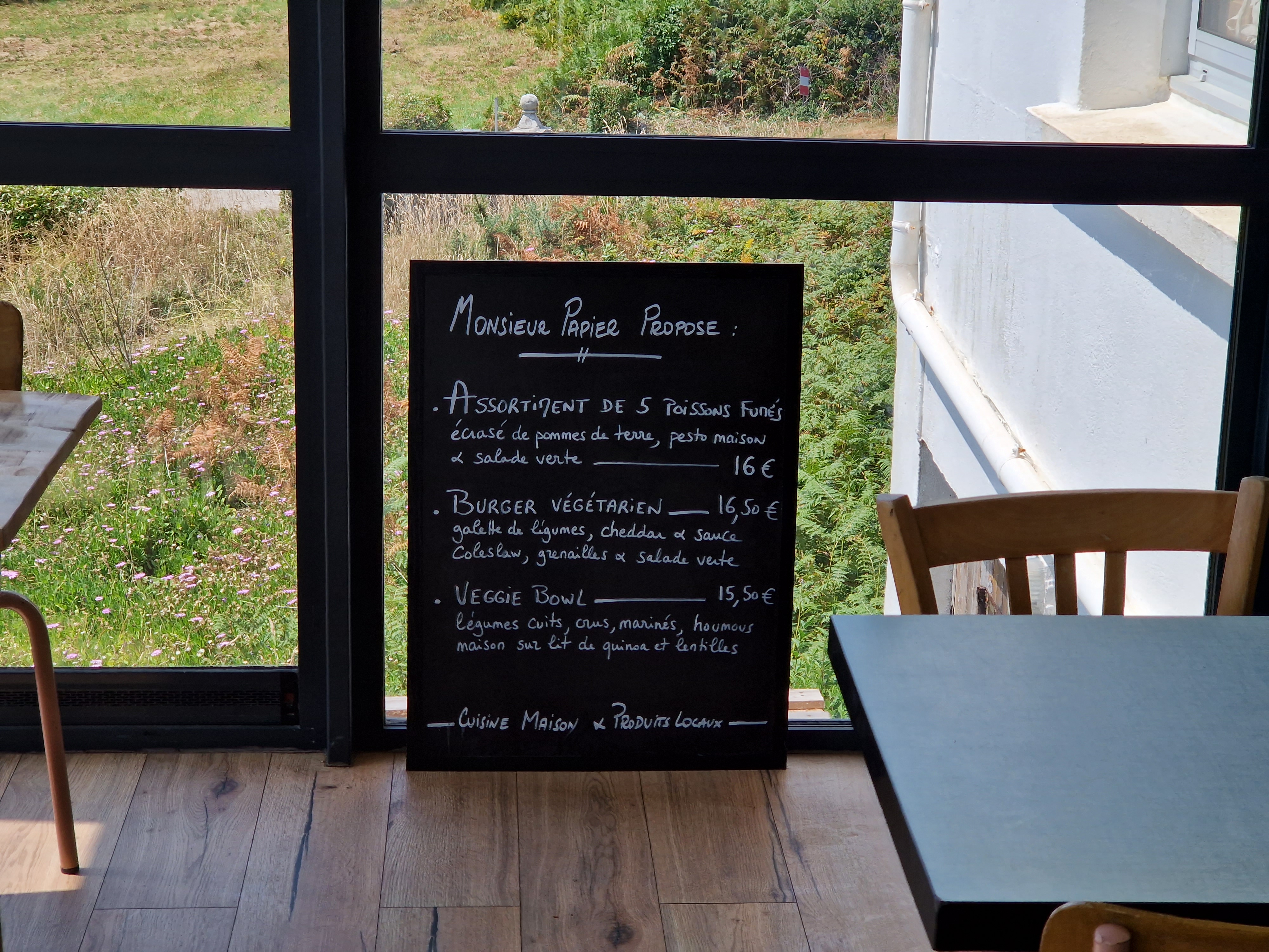 Nous recherchions un endroit calme pour le déjeuner, quelque chose de non touristique, sur le pouce avec options végétariennes. Monsieur Papier rassemble tous ces critères, avec en prime une vue à couper le souffle et un personnel très souriant. Il y avait même tout une gamme de thé que nous n'aurions jamais pensé trouver ici à la pointe du Raz ! Je recommande vivement, belle saison à l'équipe 😀