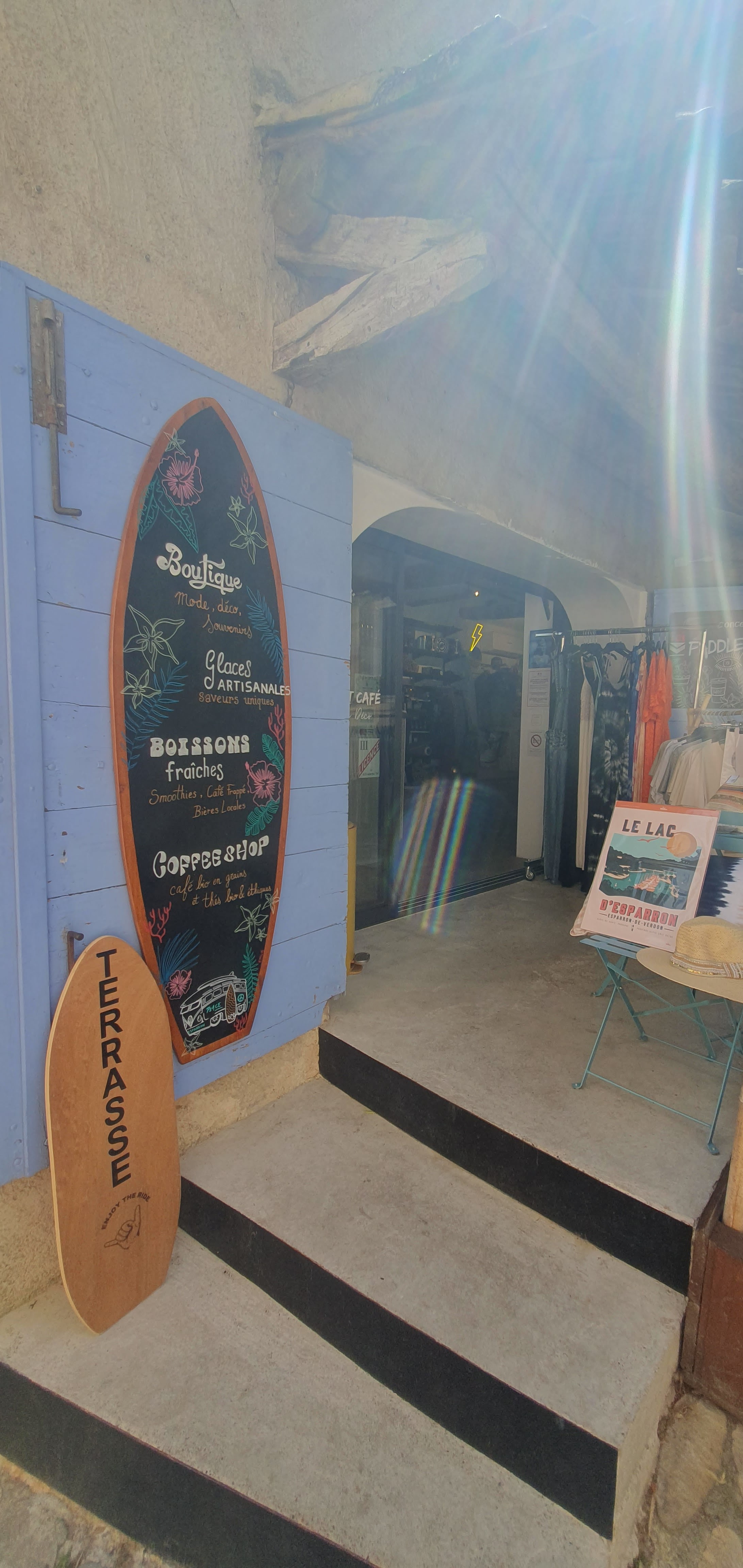 Superbe lieu hybride, à découvrir tant pour ses glaces, boissons et planches que pour les vêtements et bijoux ; mais surtout une sélection d’œuvres d’art et d’objets artisanaux créés au bord de l’eau, avec des pépites, pour toutes les bourses ! Le couple qui vous sert est très sympa et de très bon conseil, pour ne rien gâcher ! À voir absolument si vous allez à Esparron de Verdon !