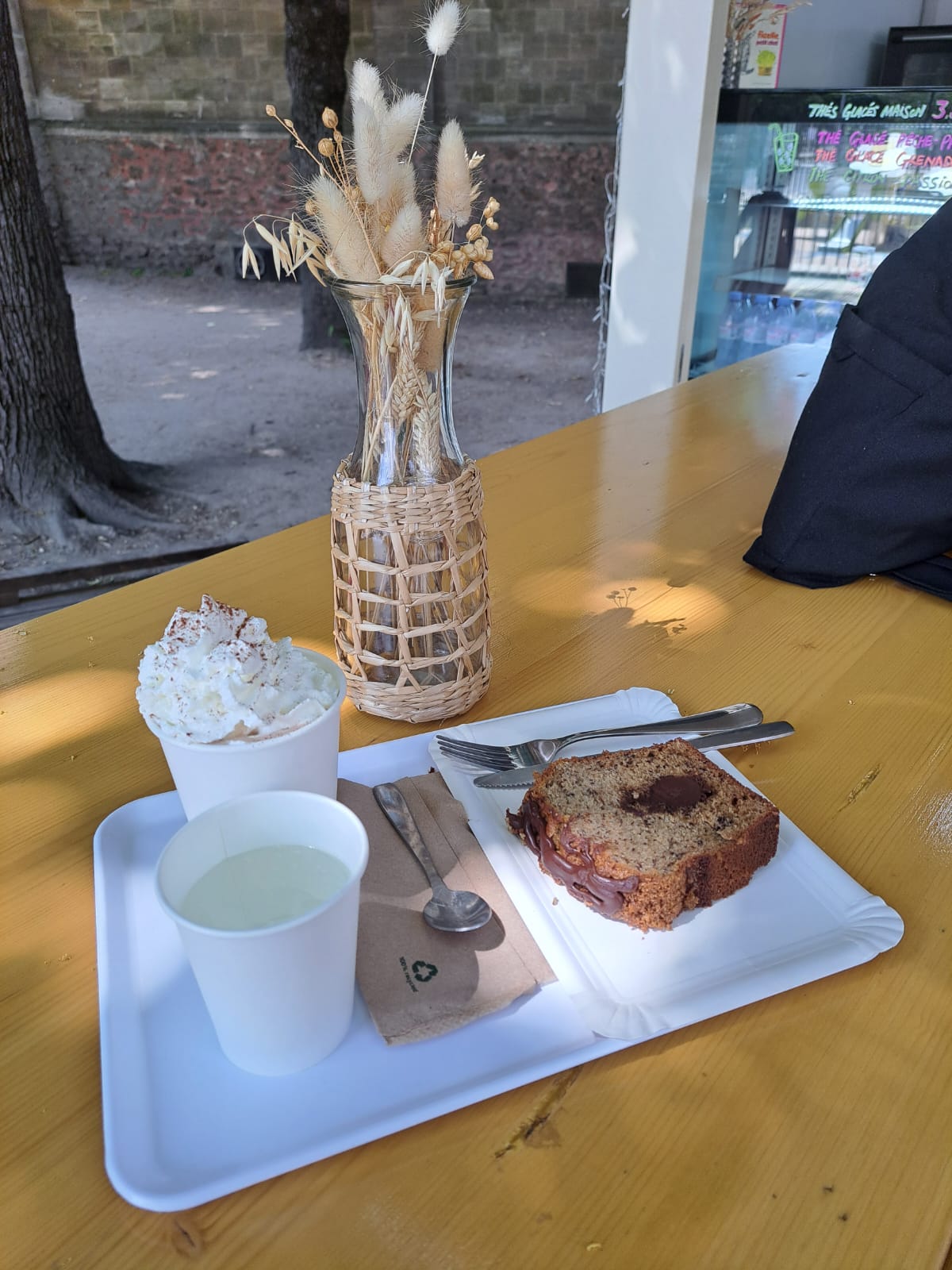 Banana bread excellent. Bubble tea matcha glacé très bon. Hâte de tester la suite. Super spot pour les familles avec le parc et le manège à côté. Vivement les beaux jours.