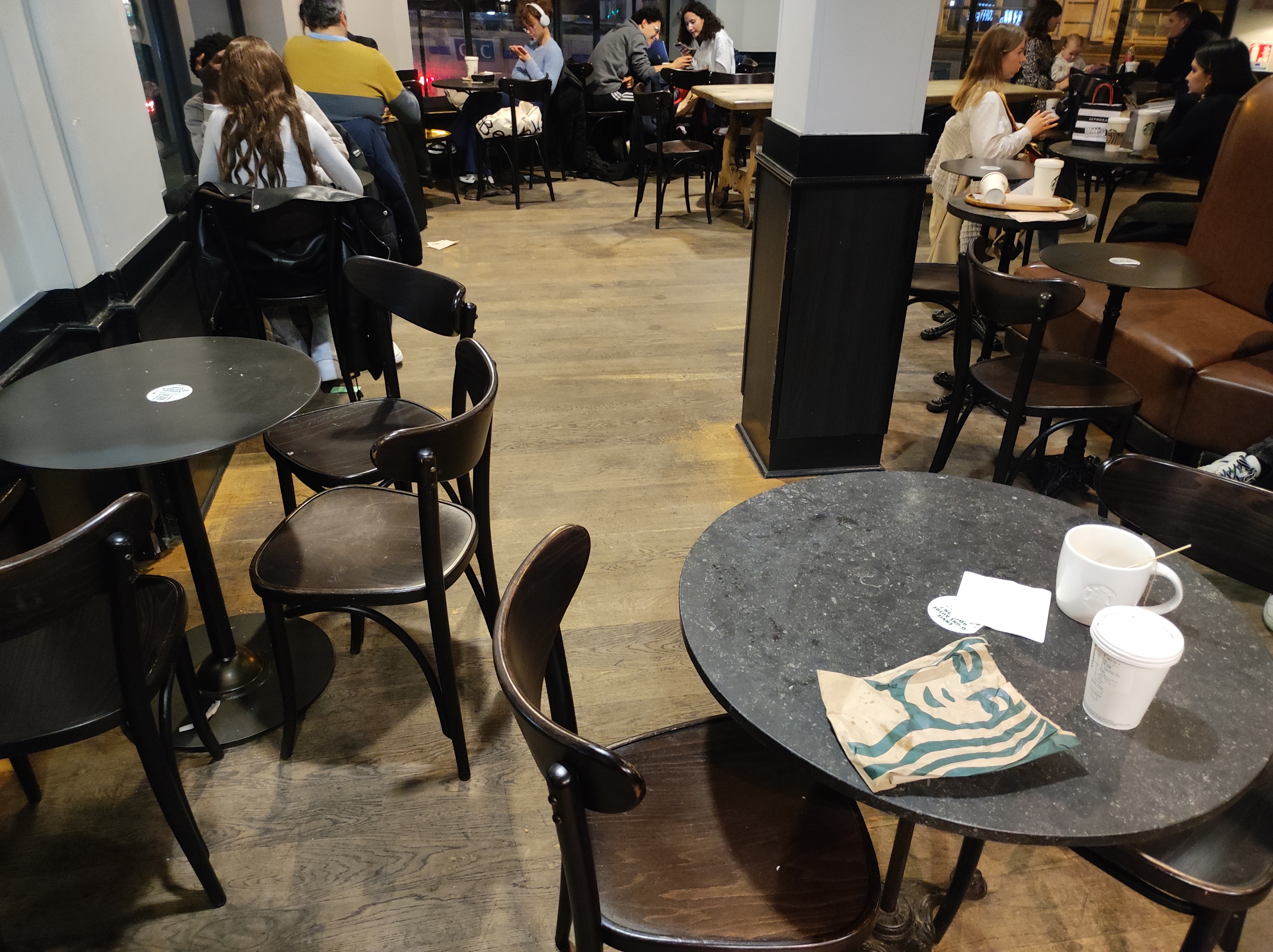 Second service à la demande auprès des membres du staff, servis à table comme ça on ne laisse pas ses affaires seules. Attention, je me suis fait voler mon tel dans la Starbucks, je n ai rien vu, heureusement ma police l a pris en flag et j'ai récupéré mon tel. Faites Super attention aux pickpockets Starbucks est l un de leur terrain de chasse préféré. Be aware of pickpockets there.