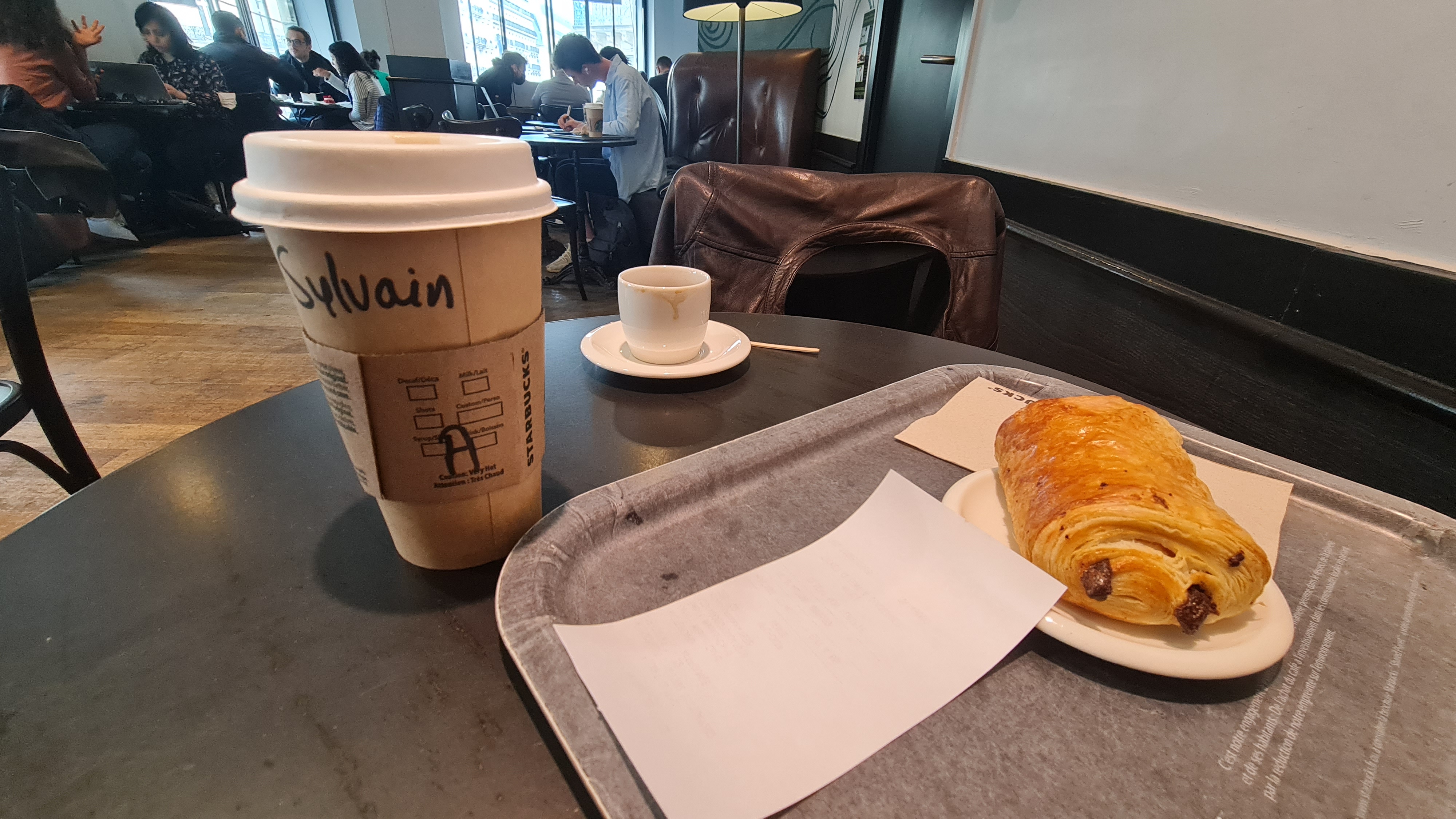 Accueil comme toujours agréable dans un Starbucks et celui-ci n'a pas dérogé à la règle. Dommage que le prénom de la personne à la caisse n'apparaisse pas sur le ticket. Cool, merci monsieur, vous m'aidez à passer une bonne journée (et pourtant...). 🙂