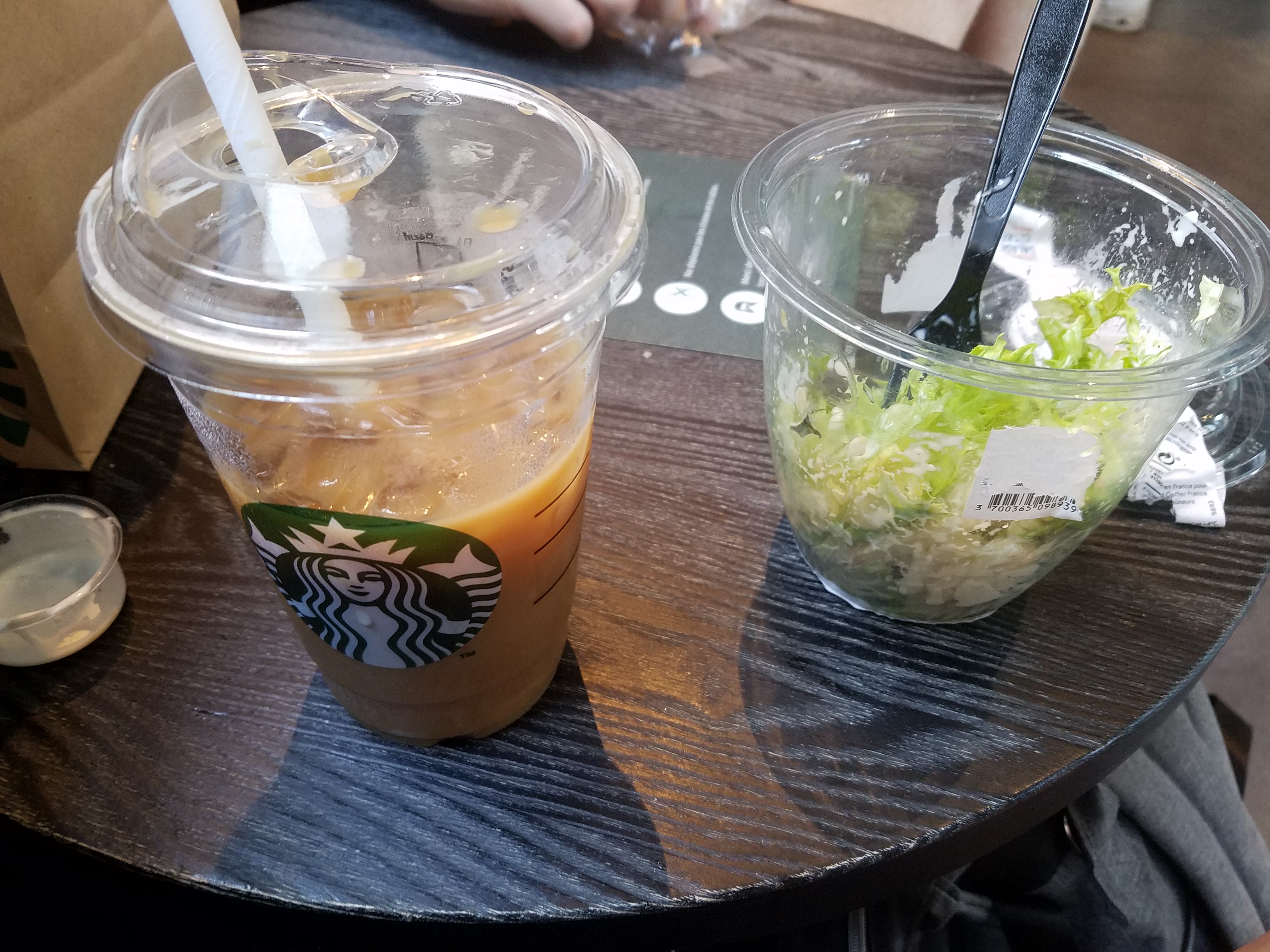 Ils ont du chai tea sans lait d'habitude, cette fois c'était au lait ou autre chose, j'ai pris autre chose: un frappuchino caramel latte en petit format, tall. Je suis cependant déçue par Starbucks de par le fait qu'il n'y ait pas de chai nature possible, lorsque le chai tea latte l'est ; cela laisse fortement à penser que leur chai tea latte est quasi tout préparé... liophilisé.