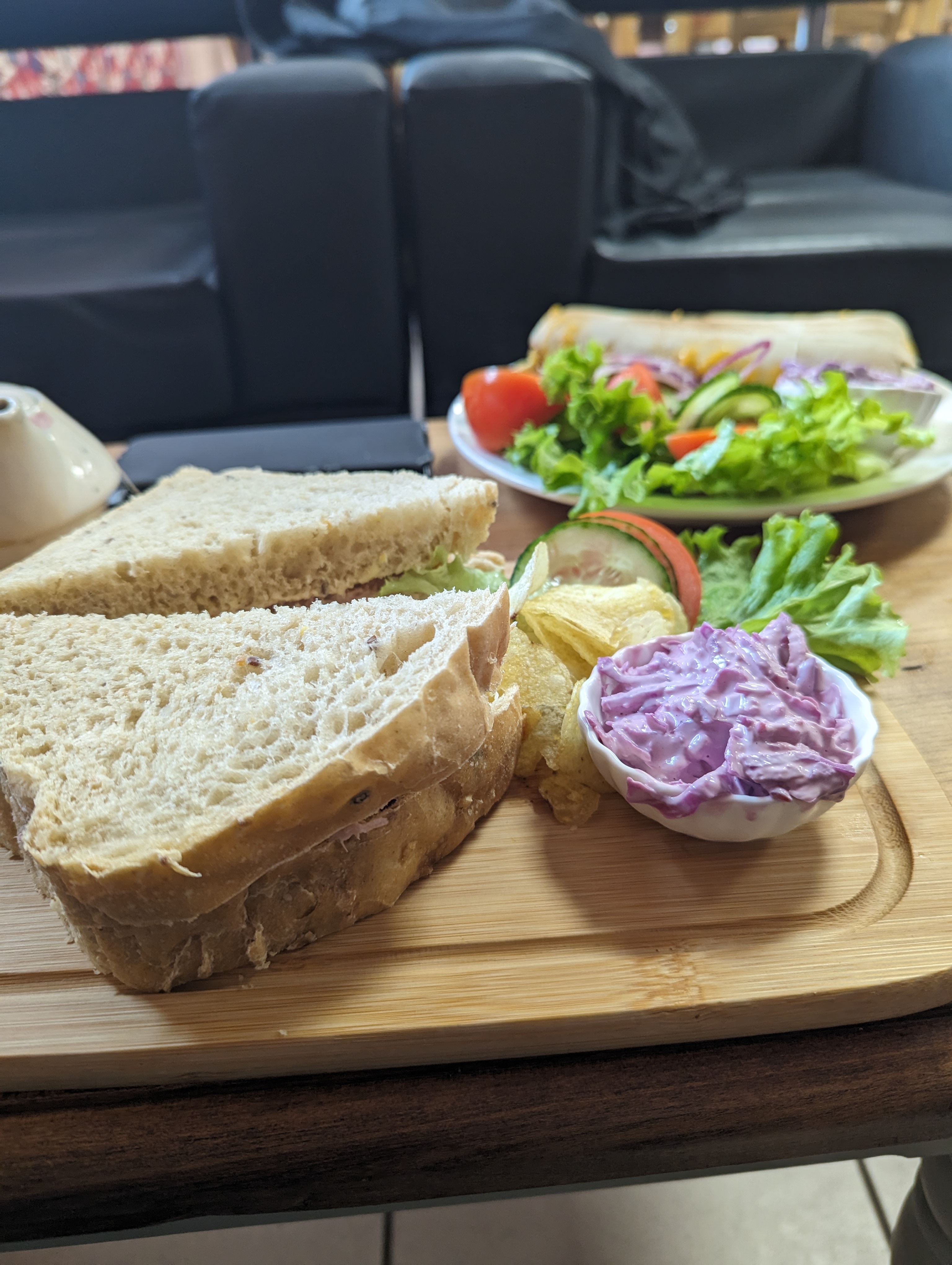 Café relaxant pour passer une heure ou deux. J'ai apprécié mon sandwich aux doigts de poisson fait maison. Essayez les gâteaux Eccles, ils sont un moment fort. Canapés confortables.