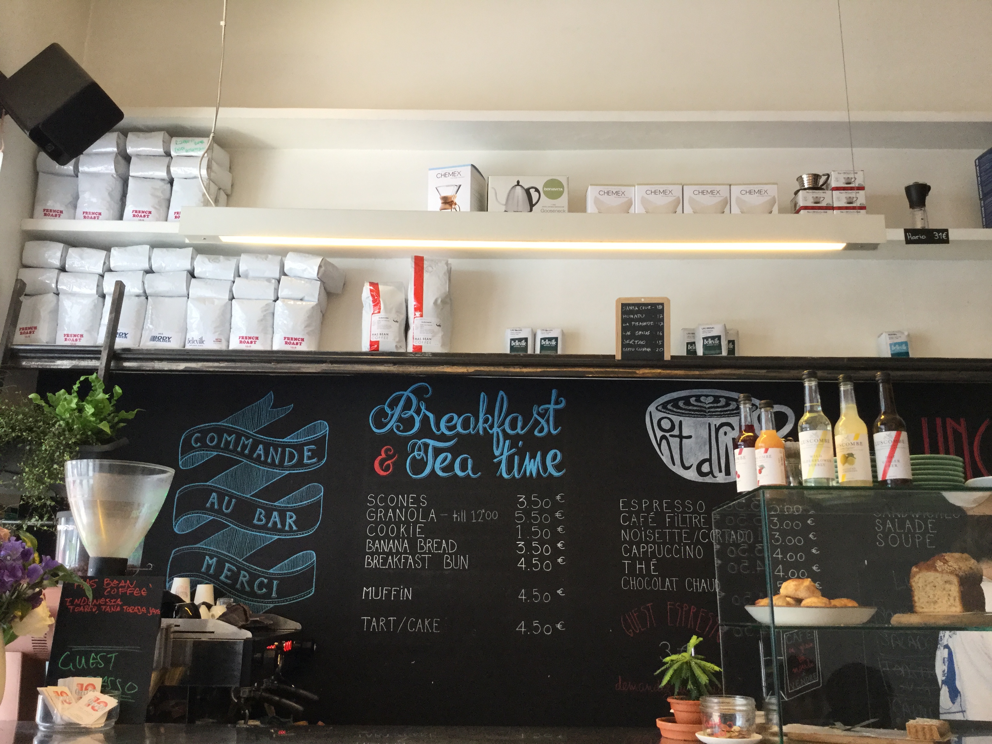 Petit lieux sympa pour boire un café filtre et déguster de merveilleux scones moelleux avec beurre et confiture de framboises, des salades diet (pois chiches, tomate, concombre, yaourt), des sandwichs (cheddar, confiture de chili, mâche), des buns délicieux (roquefort, amande, basilic) ou encore des brownies au beurre de cacahuètes ou des banana bread. Le must des Coffee shop parisien.