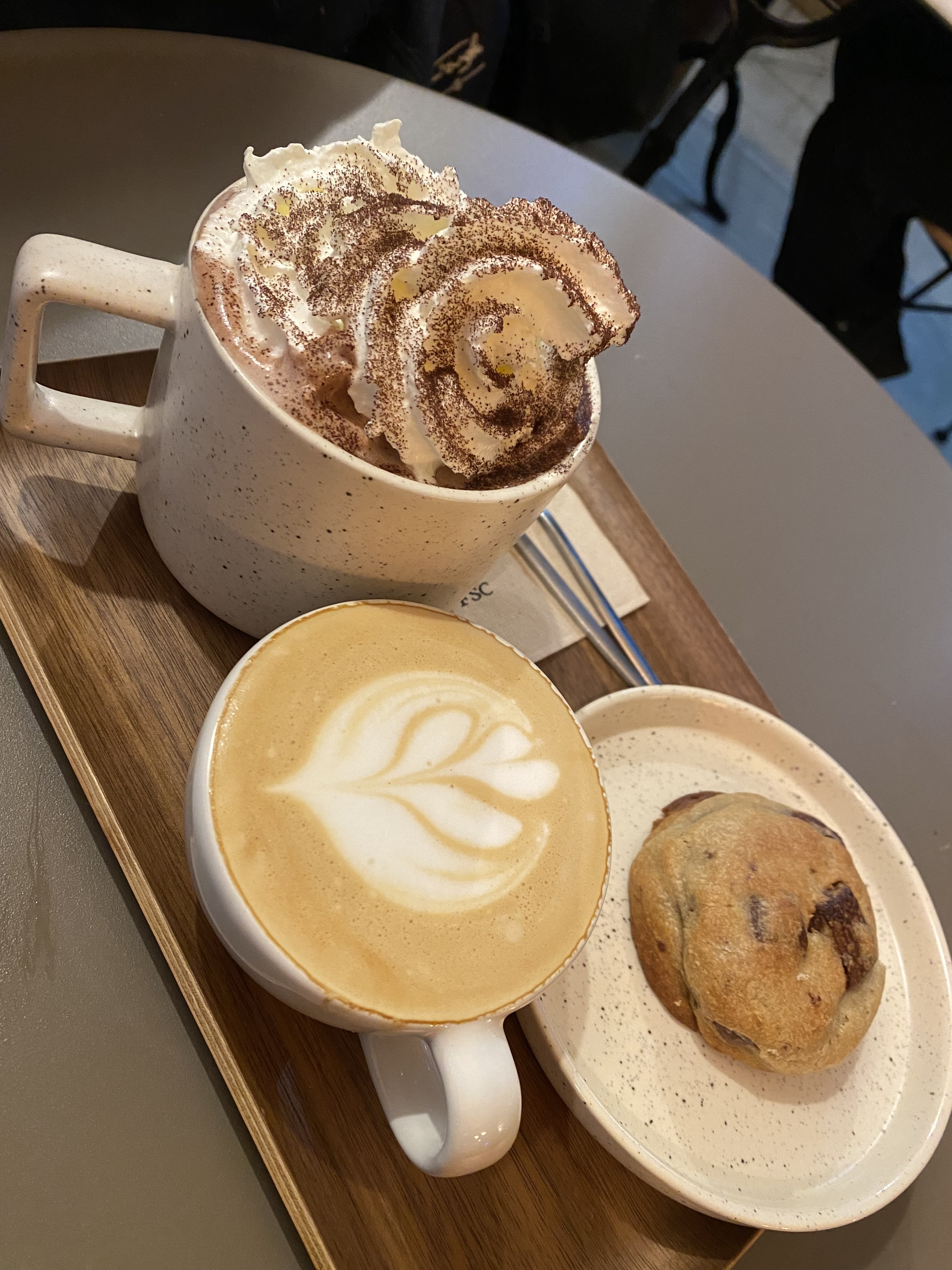 Lieu cosy chaleureux équipe souriante … les cookies une tuerie … chocolat chaud avec chantilly et cappuccino réconfortants à souhait
